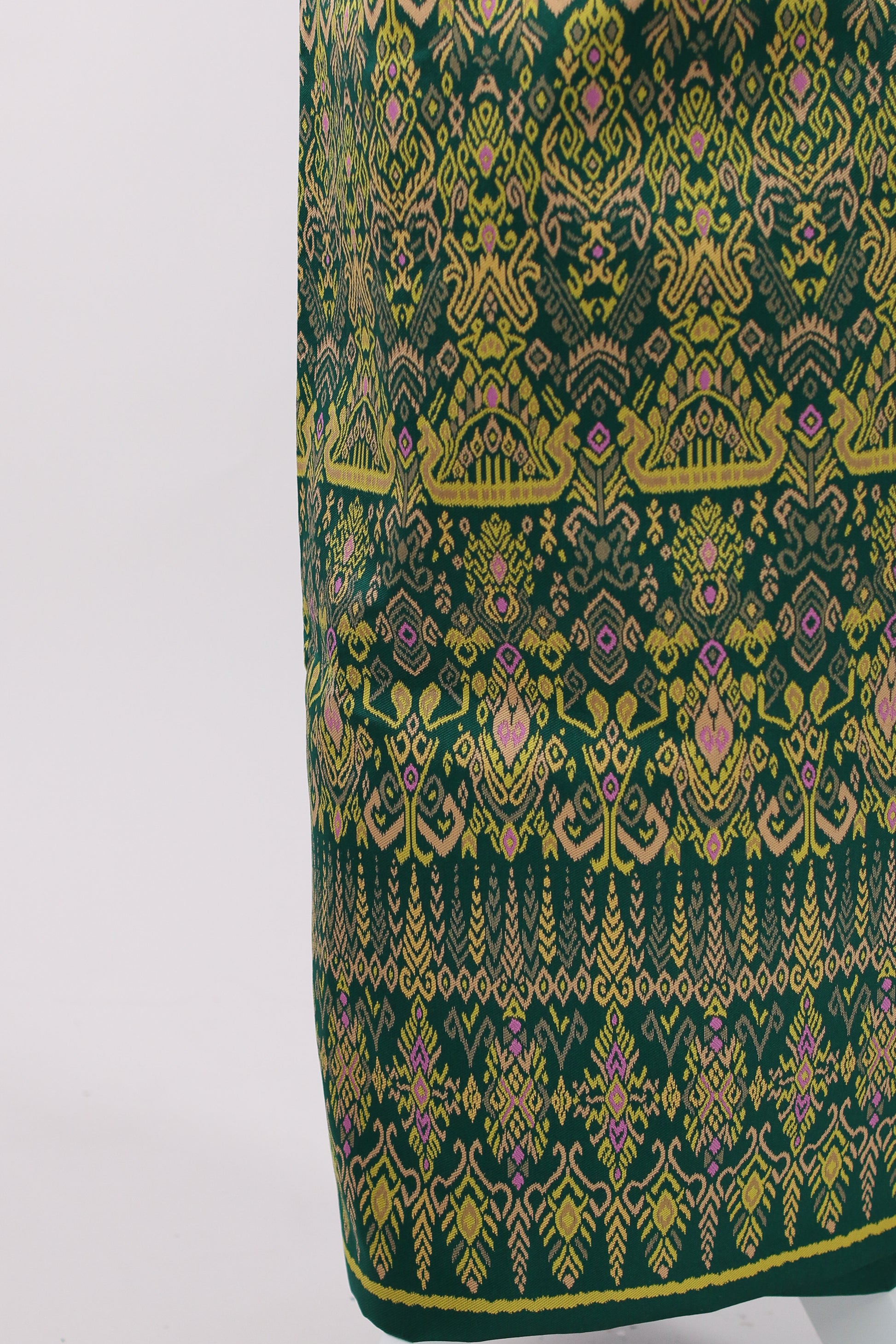 - Khmer gold-on-green geometric skirt with vertical motifs