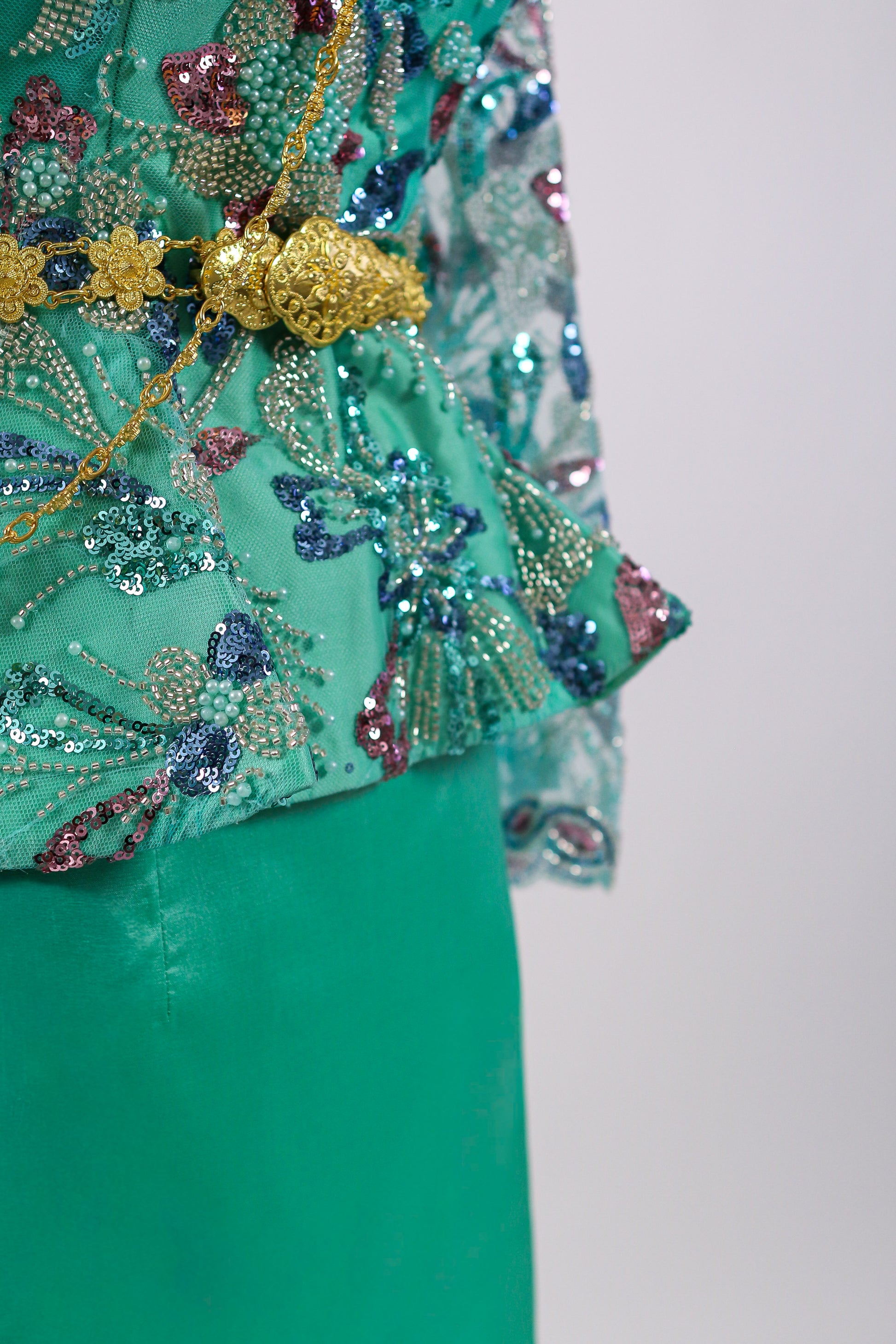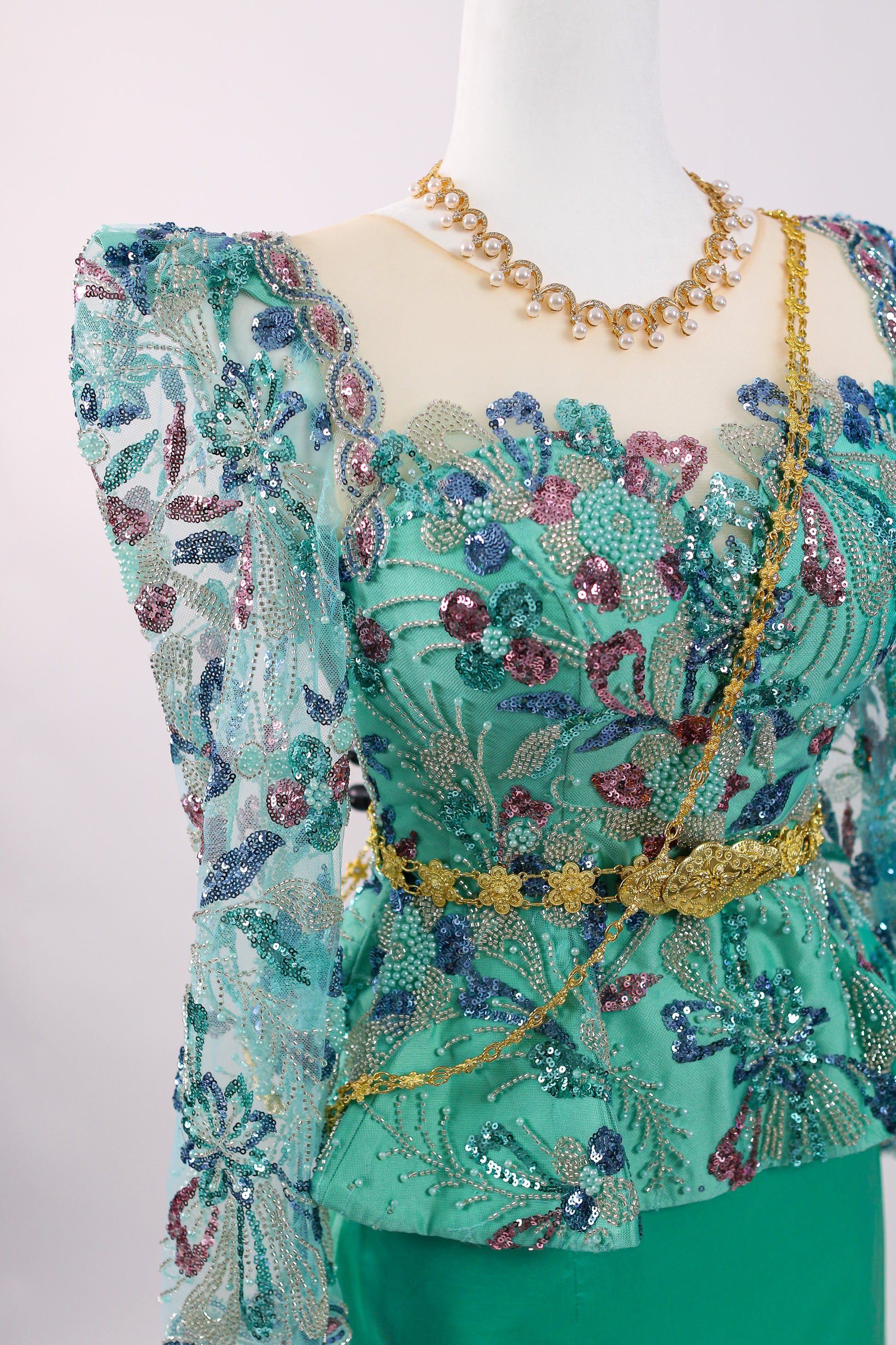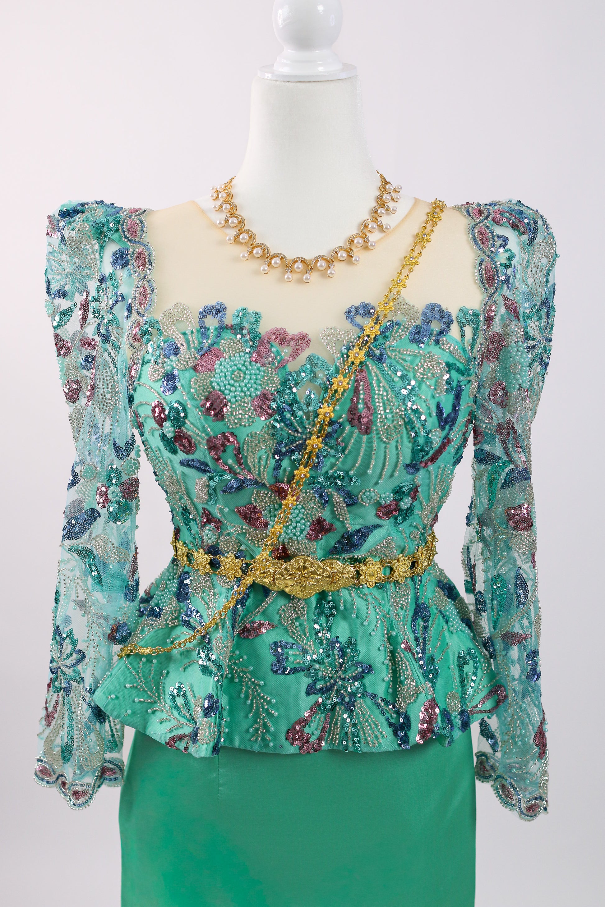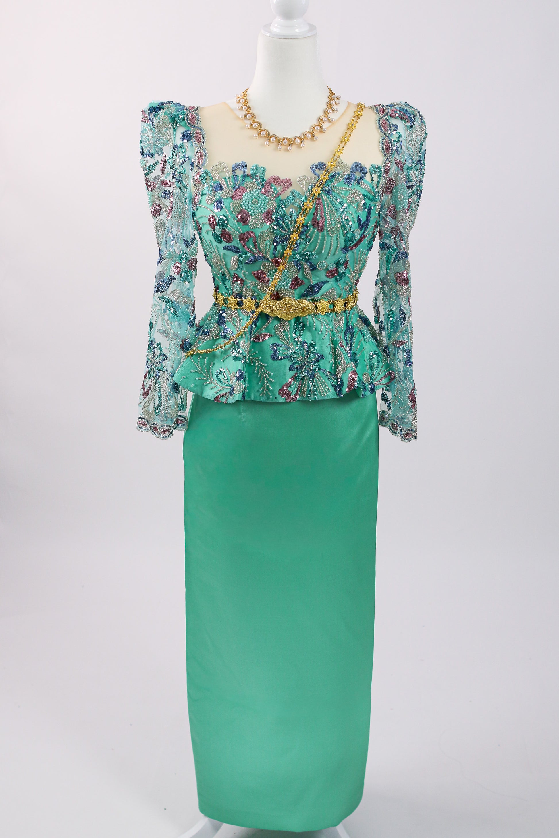 Fresh aqua-green with a sleek mint skirt, pretty and modern. Accessories shown (necklace) are not included.
