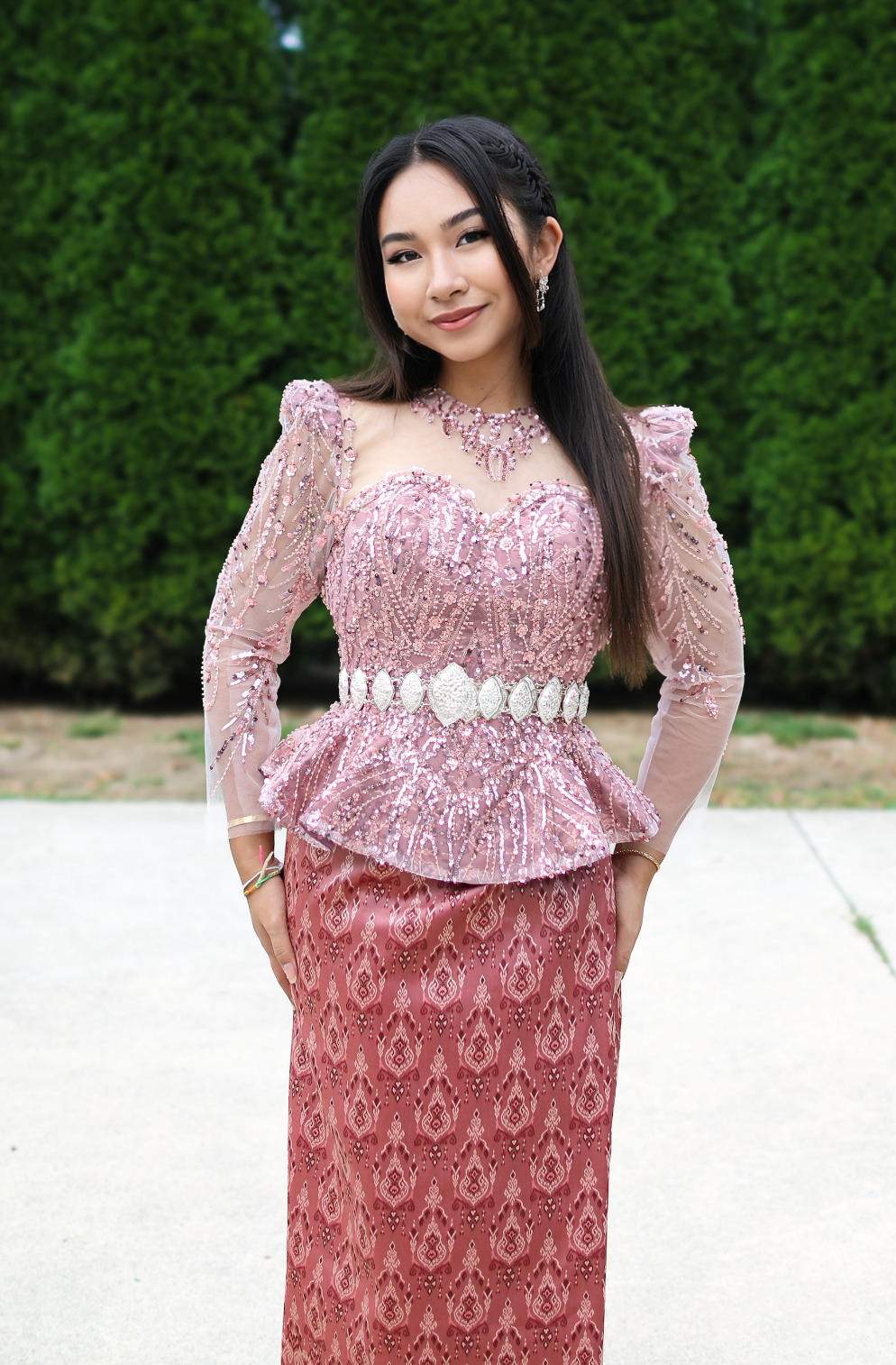 - Dusty-rose Khmer silk skirt for a graceful, lengthening line