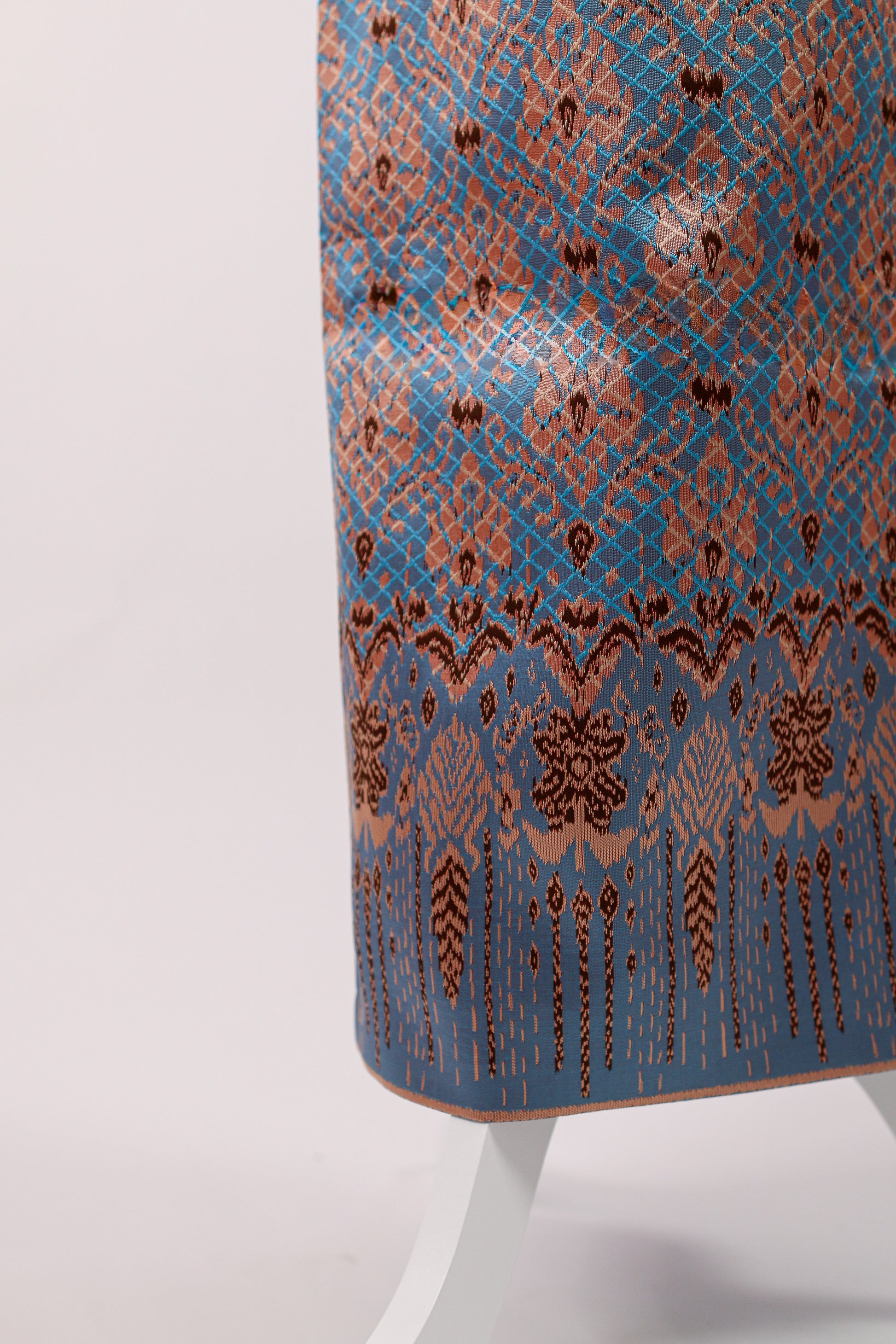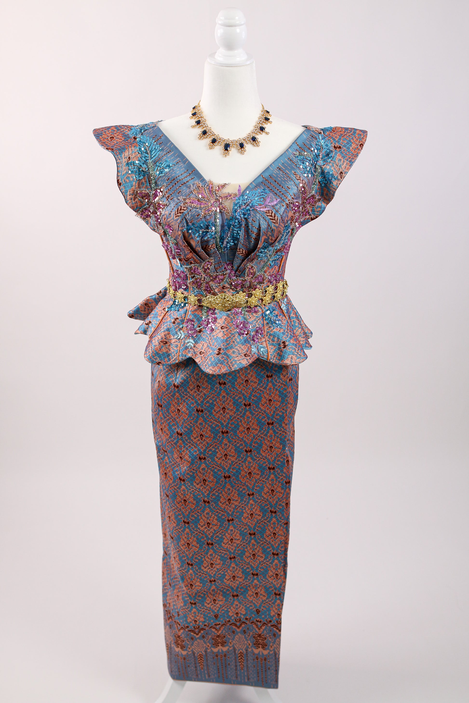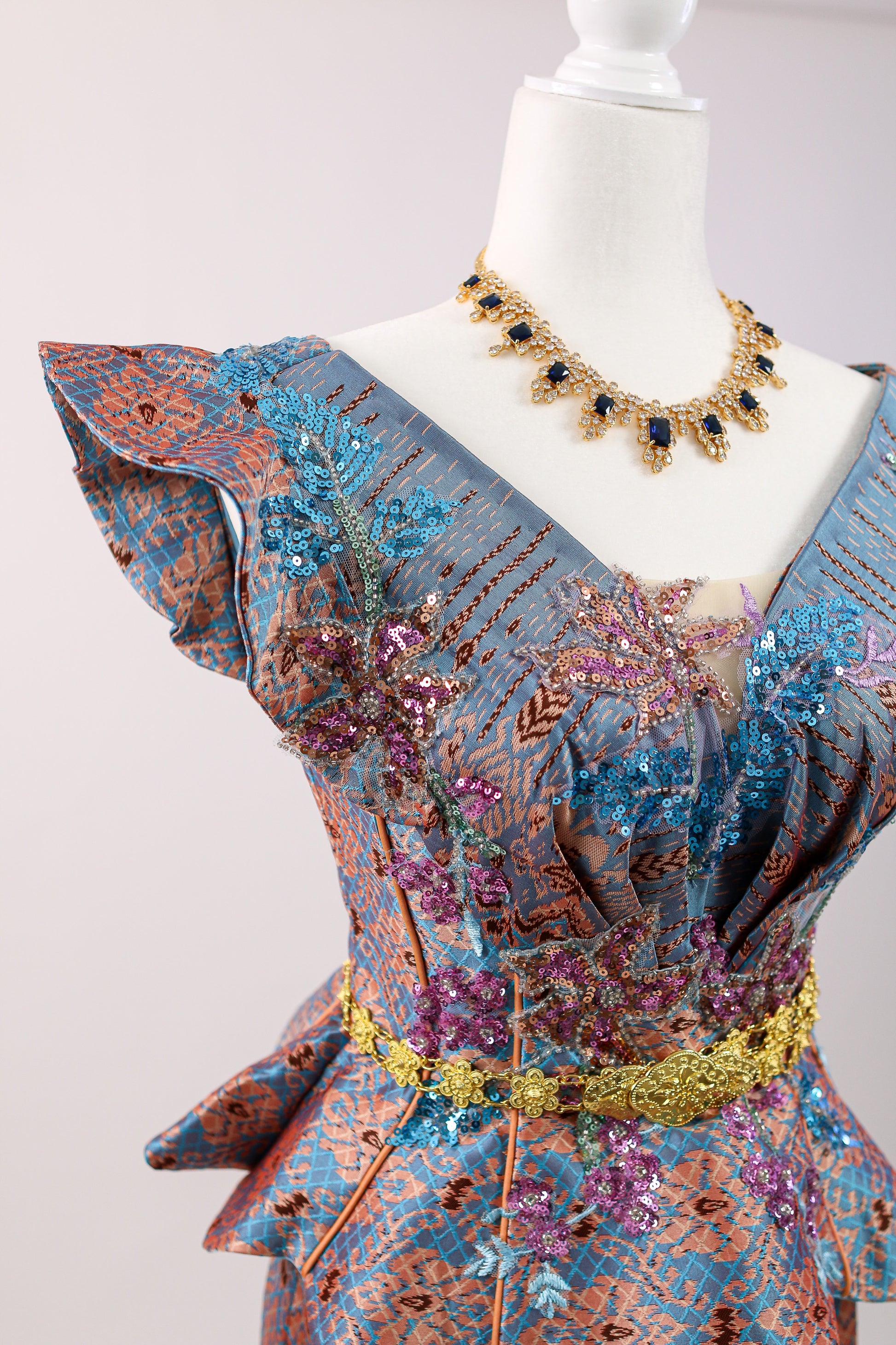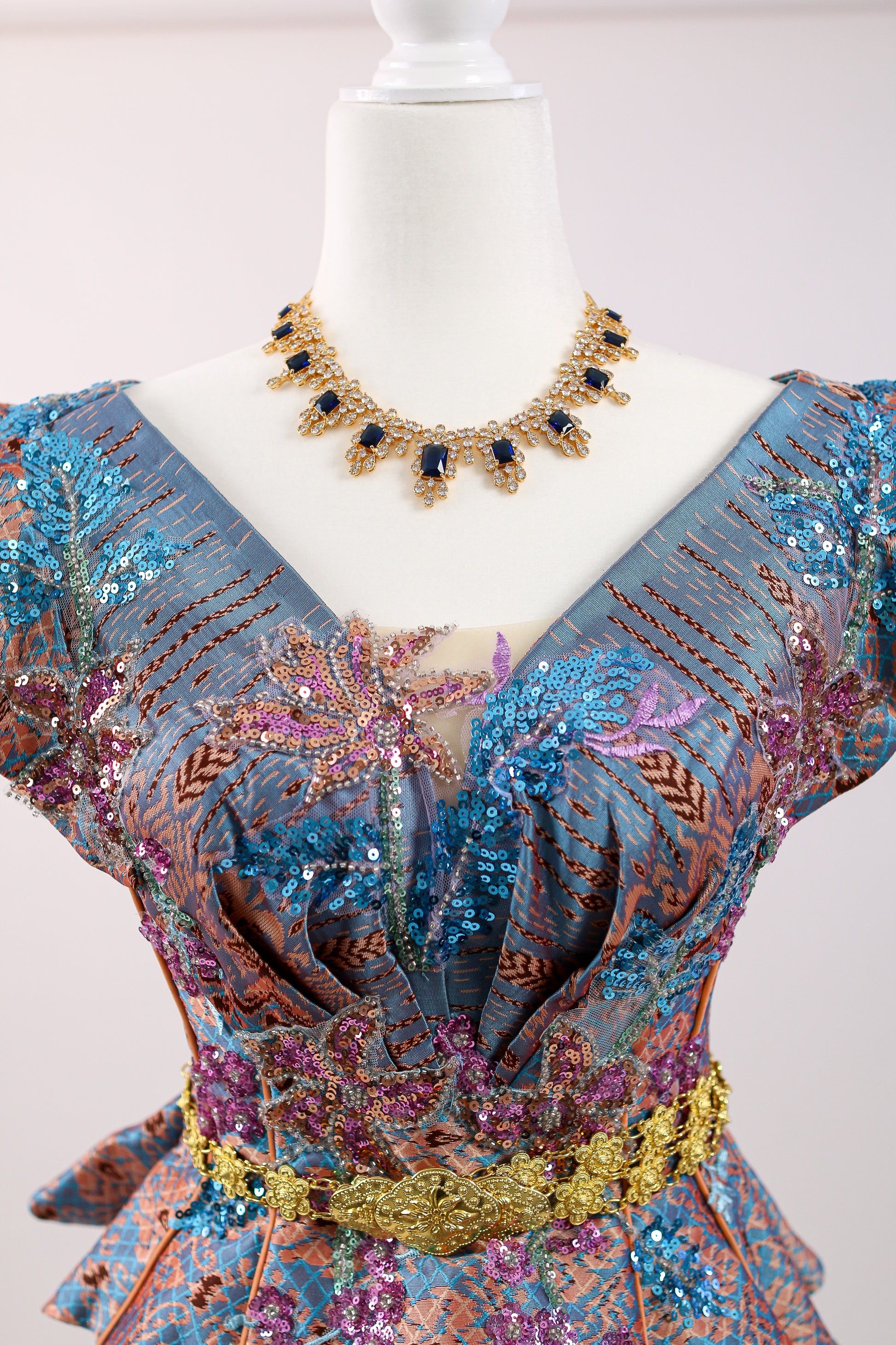 Bold blue made for parties and weddings. Accessories shown (necklace & Belt ) are not included.