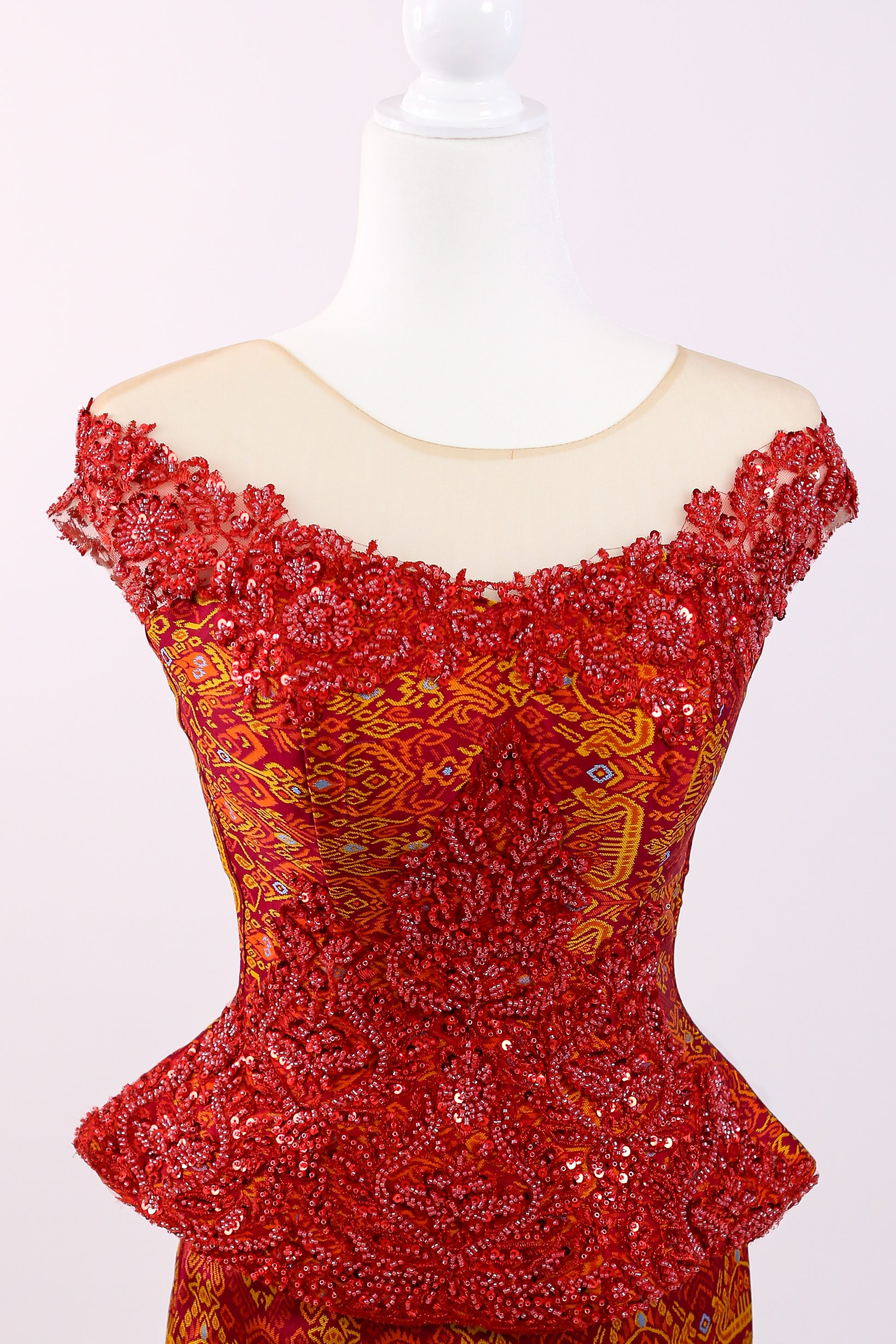 - Crimson lace with gold beading, V-sweetheart neckline, short sleeves