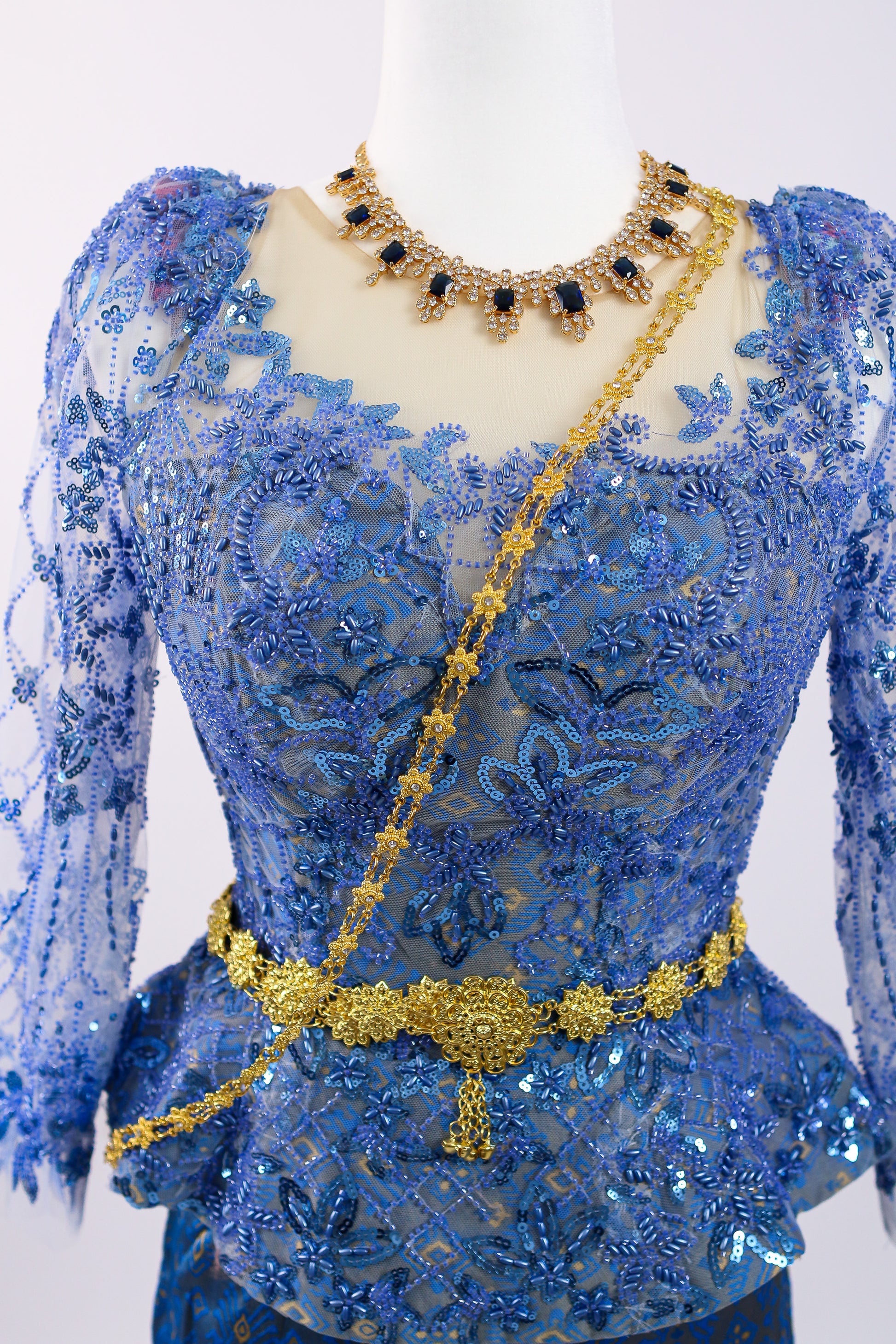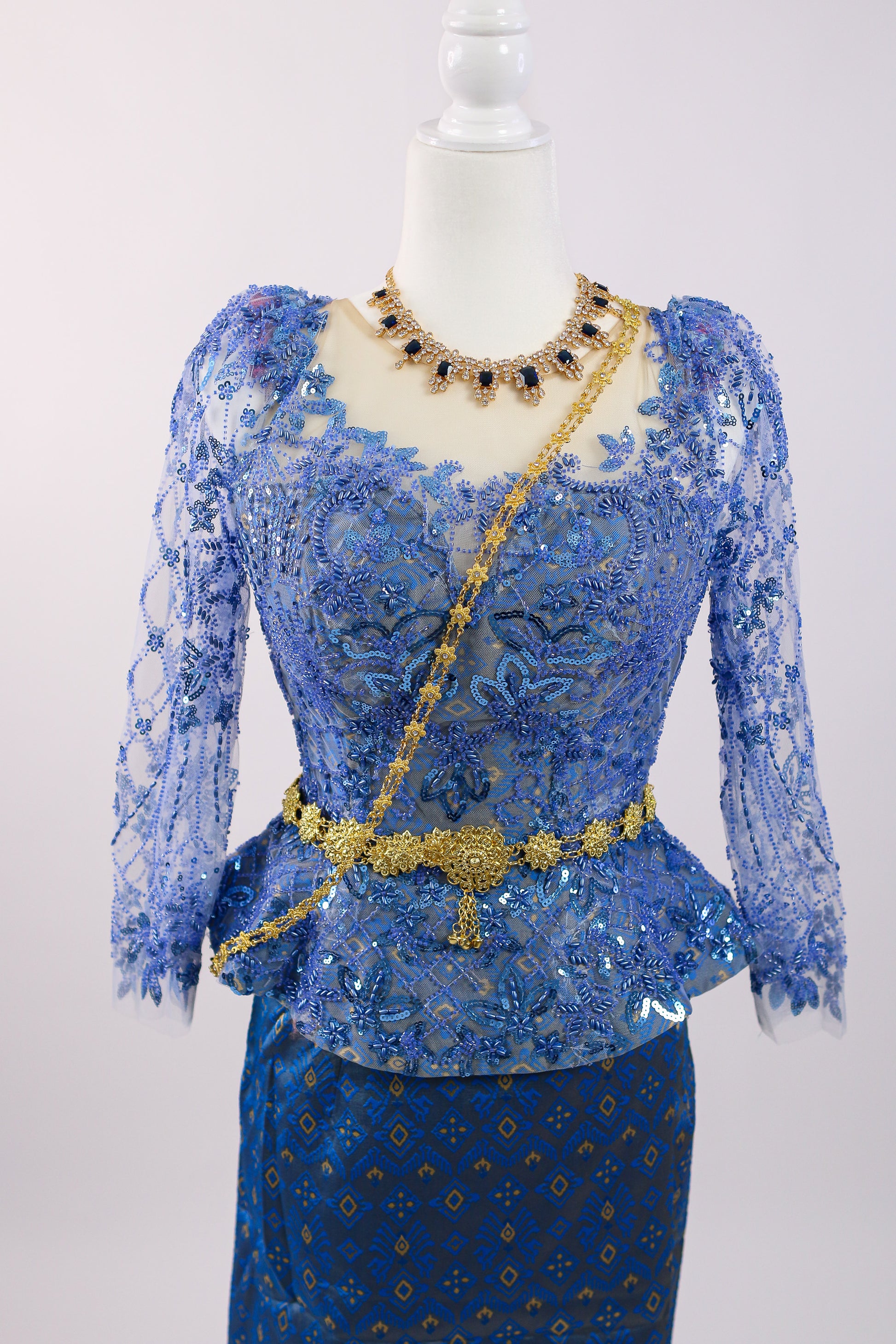 Blue floral lace with gold beadwork, sweetheart/illusion neckline, and long sleeves