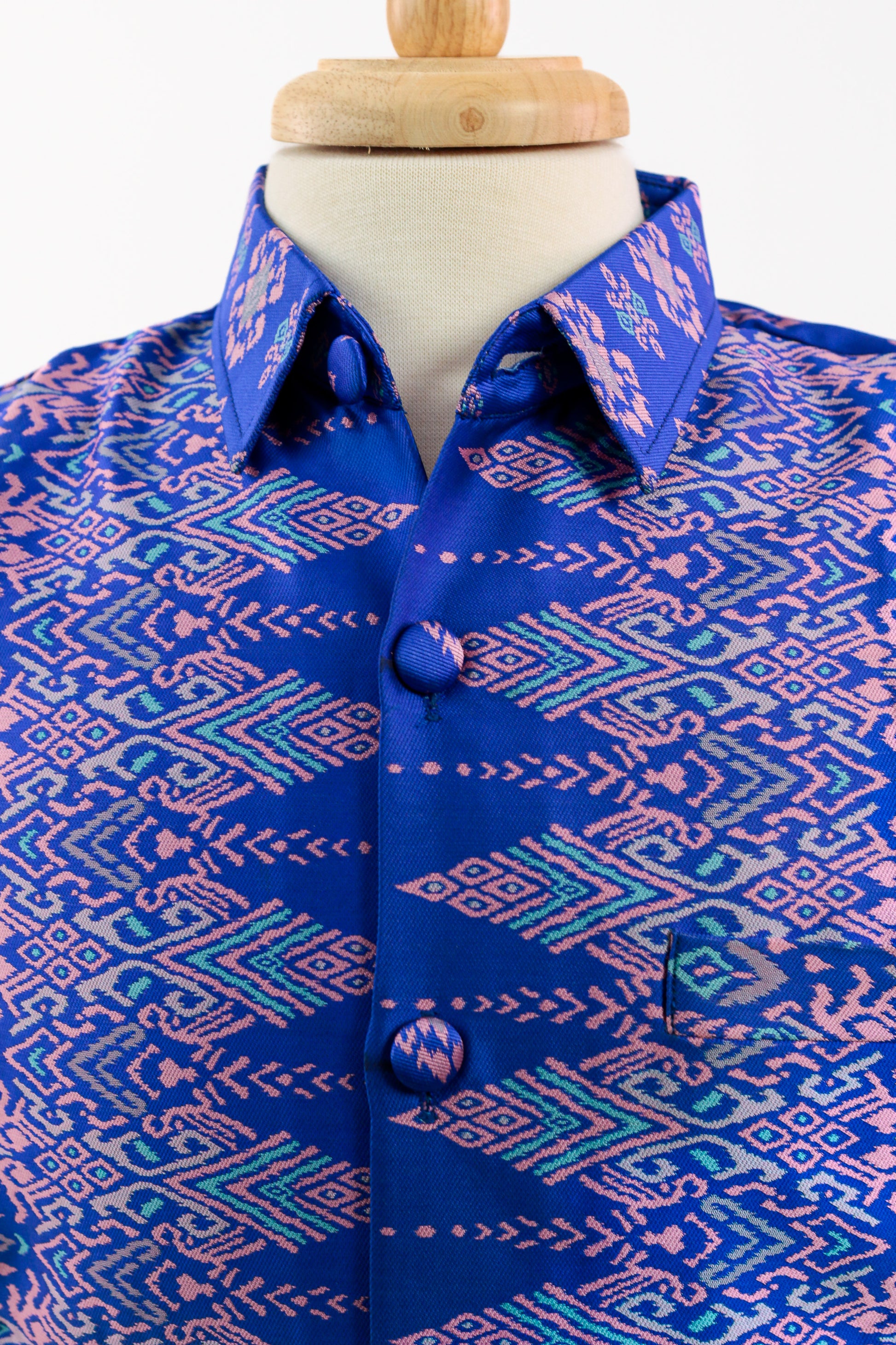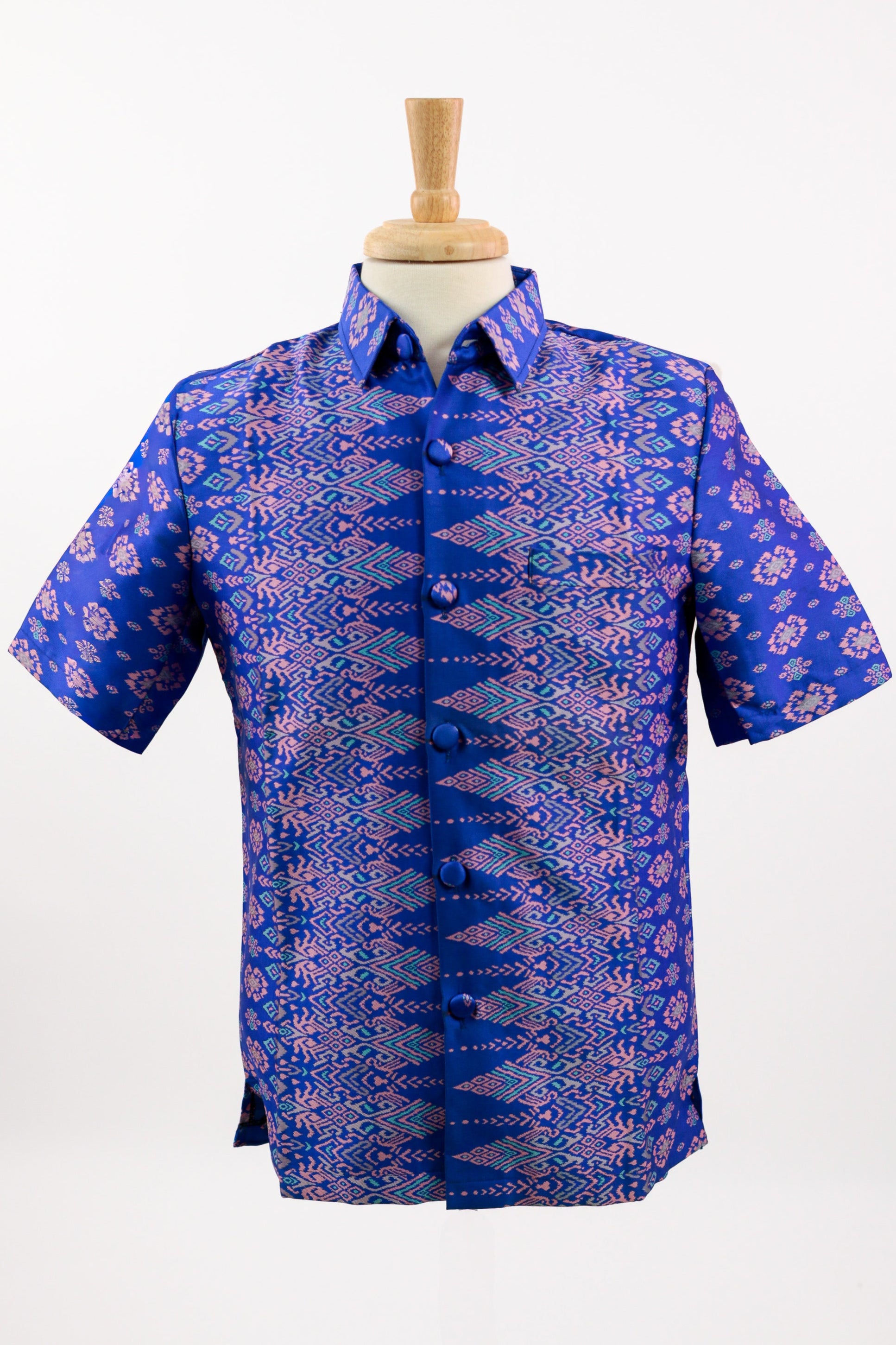 Crisp short-sleeve shirt in vivid cobalt with a sharp collar and neat buttons.