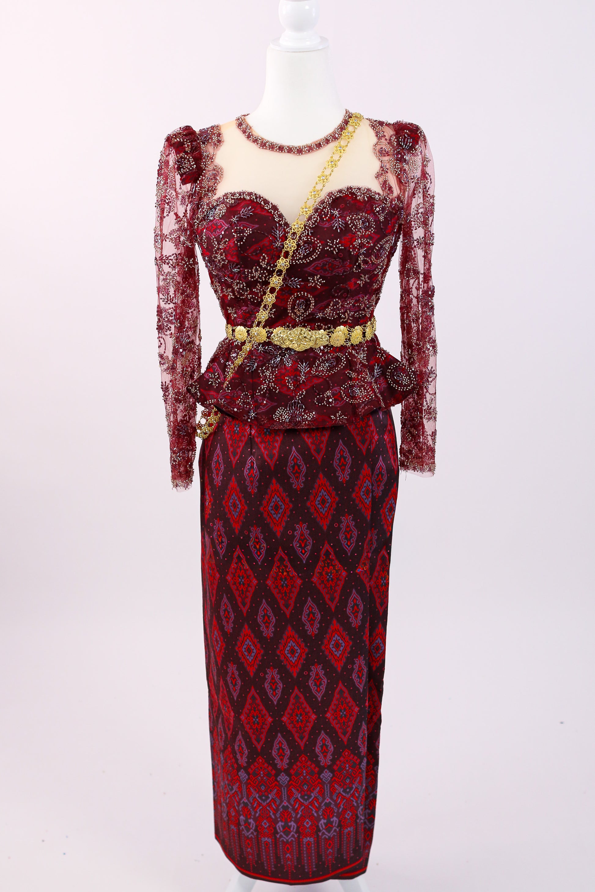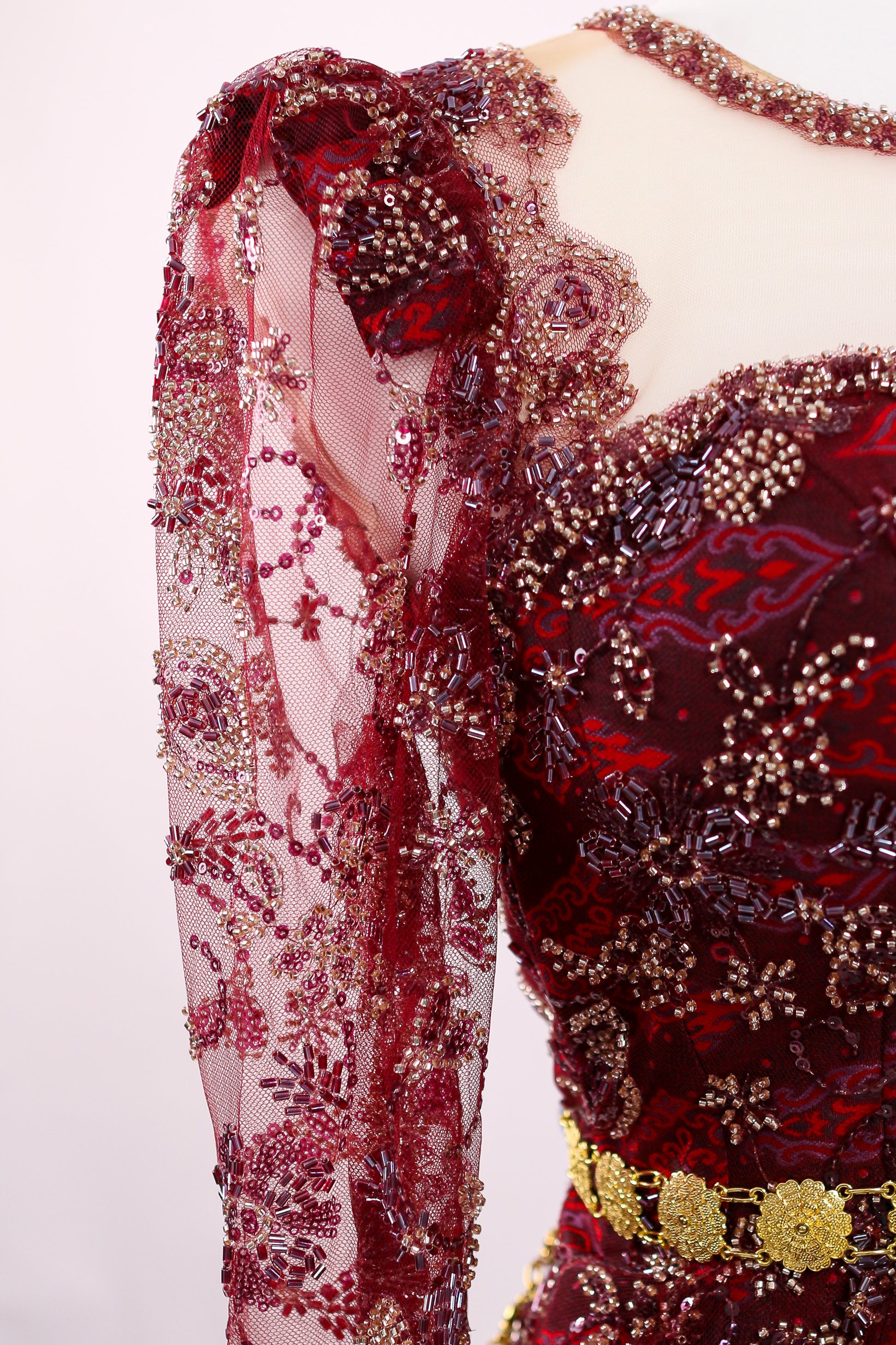 - Burgundy-red lace with gold bead clusters, sweetheart/illusion neckline, long sleeves