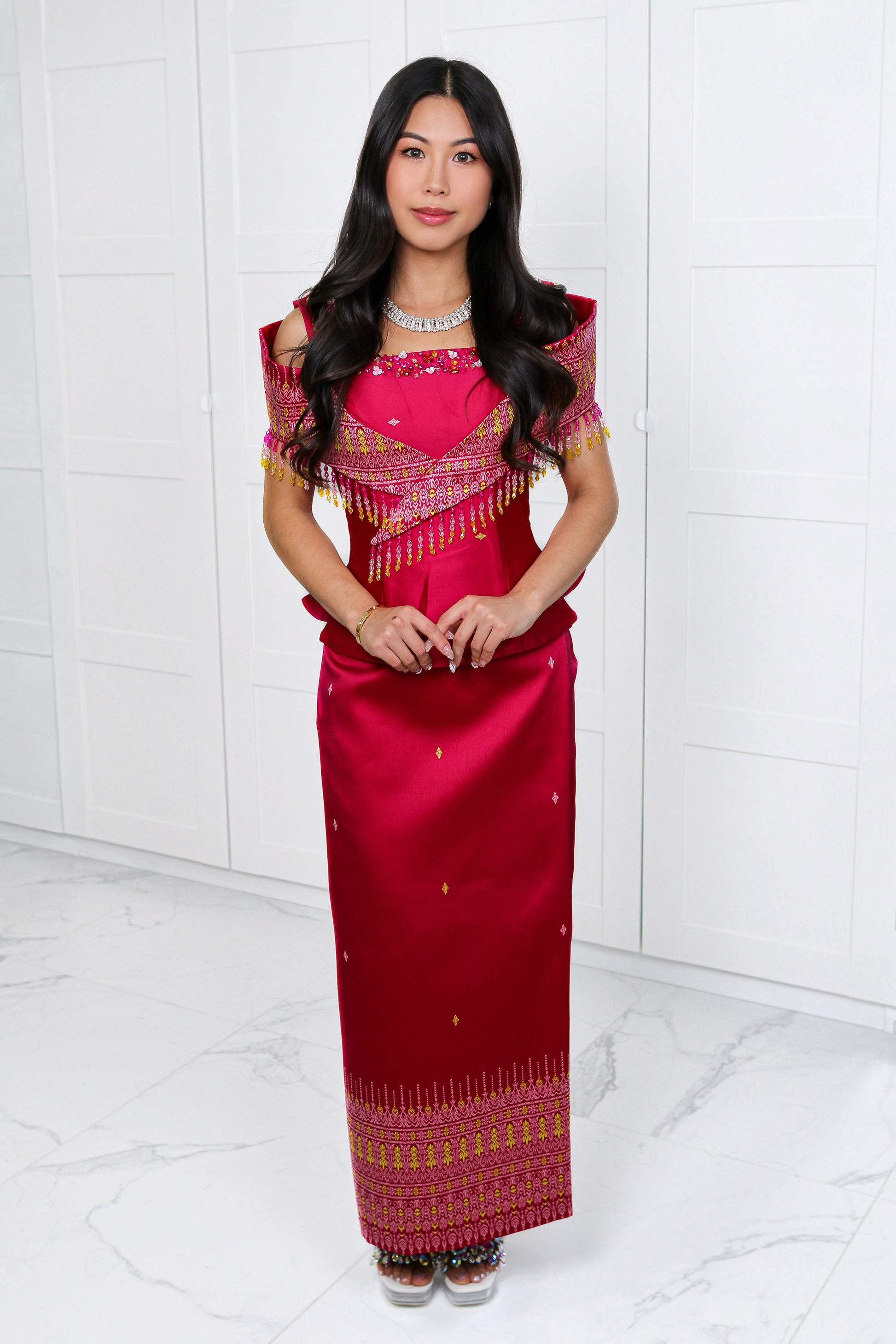 - Matching satin Khmer skirt for a statuesque silhouette