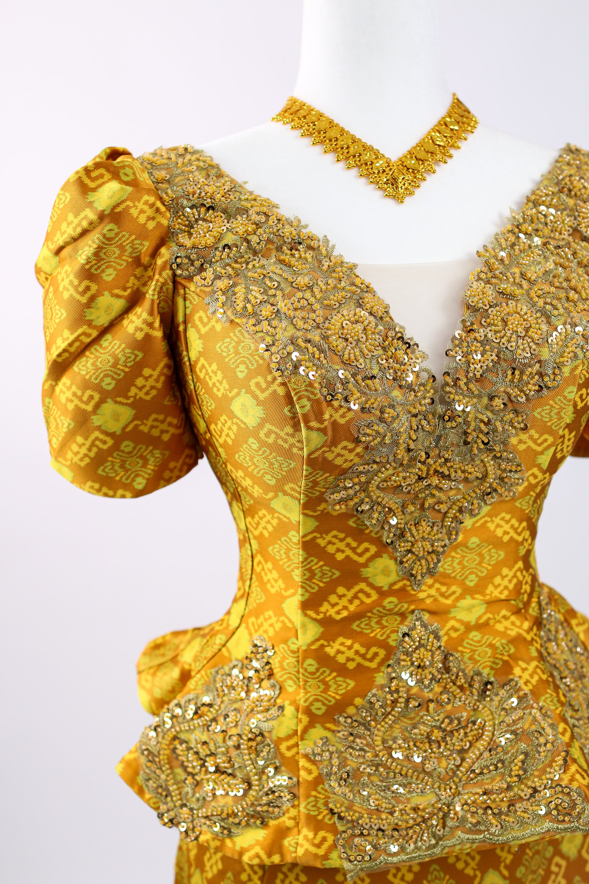- Gold beaded lace with sweetheart neckline and short puff sleeves