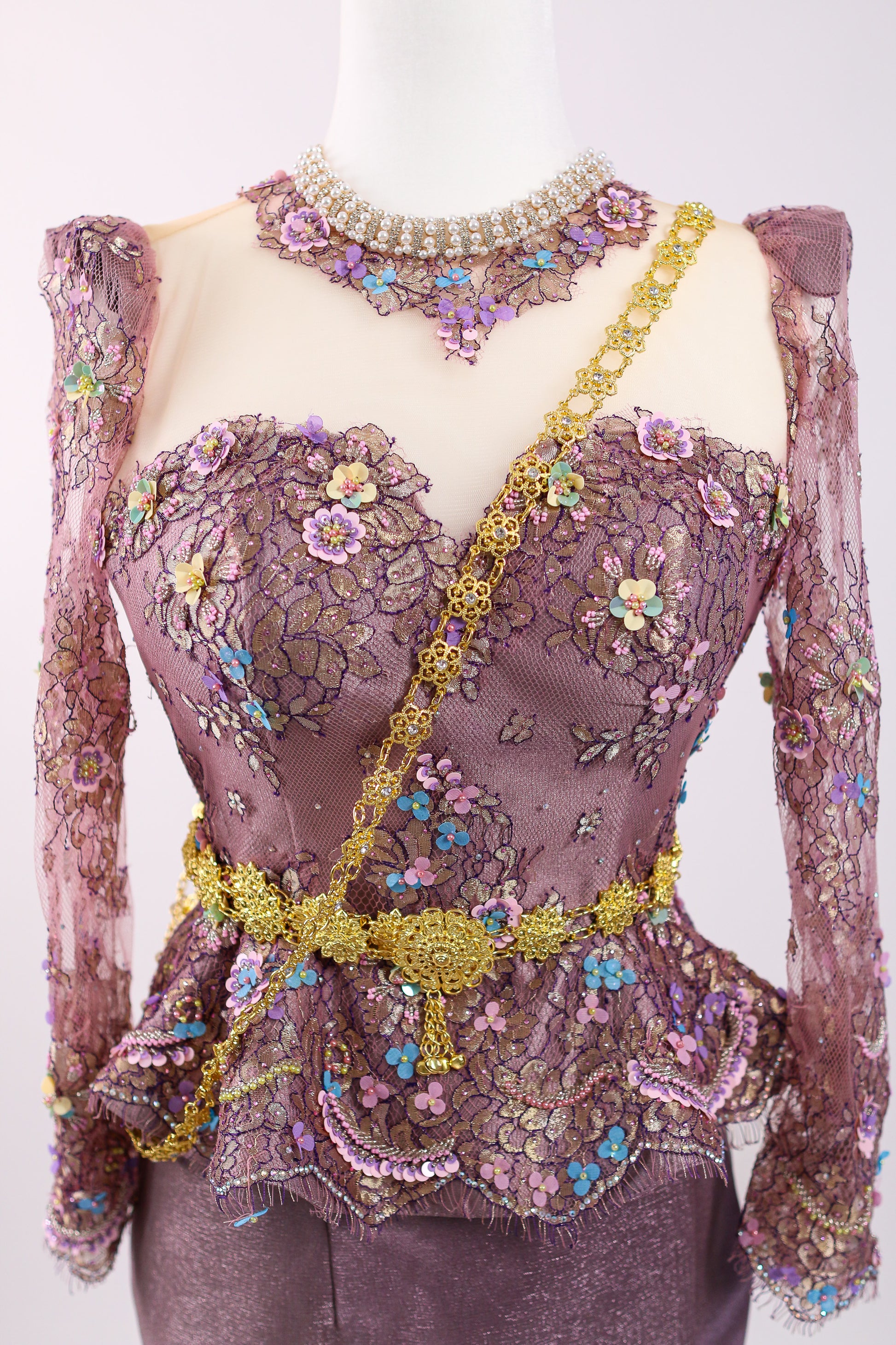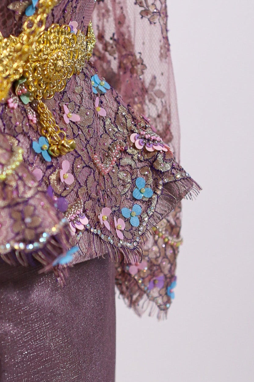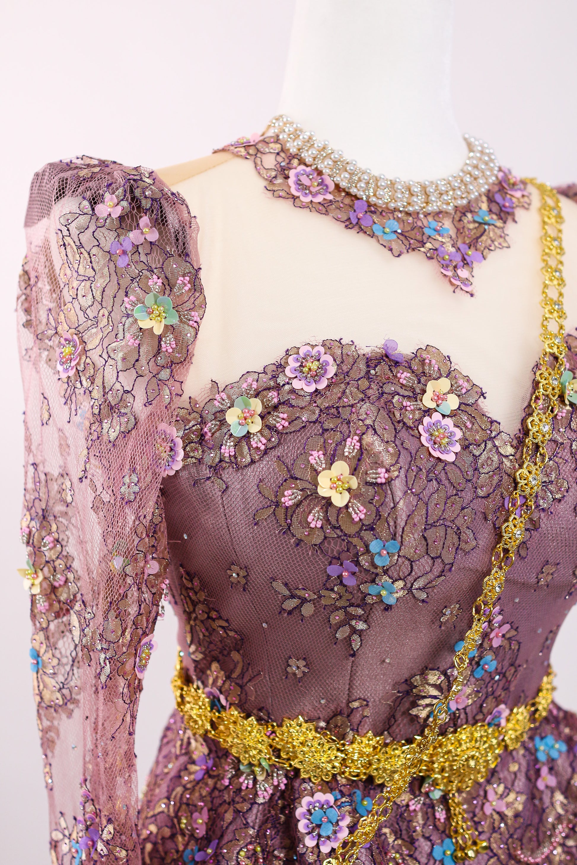 - Purple floral lace with gold/lilac beadwork, sweetheart neckline, and long sleeves