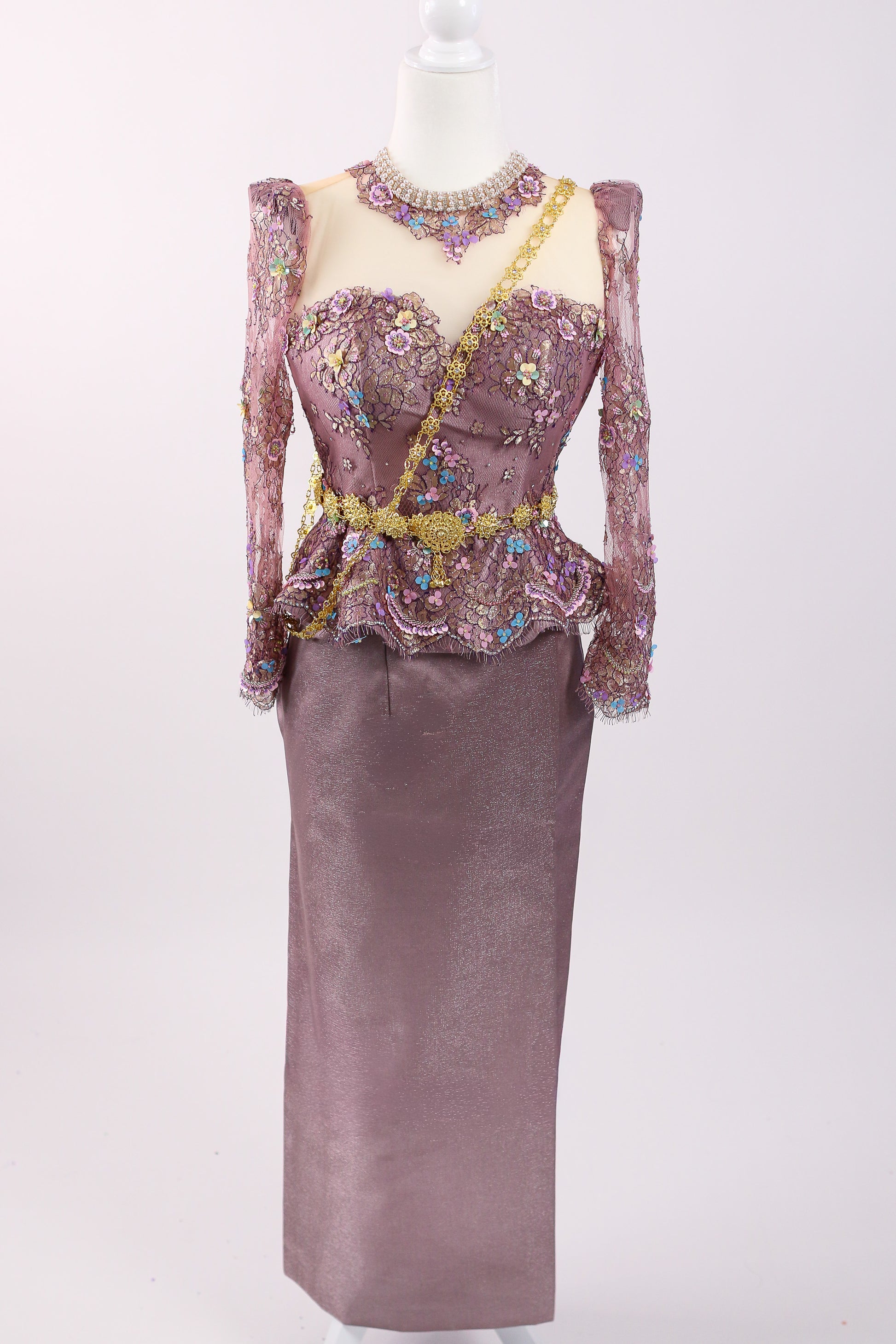 Romantic lilac-purple with couture shine, perfect for weddings and parties. Accessories shown (necklace, belt, crossbody chains) are not included.