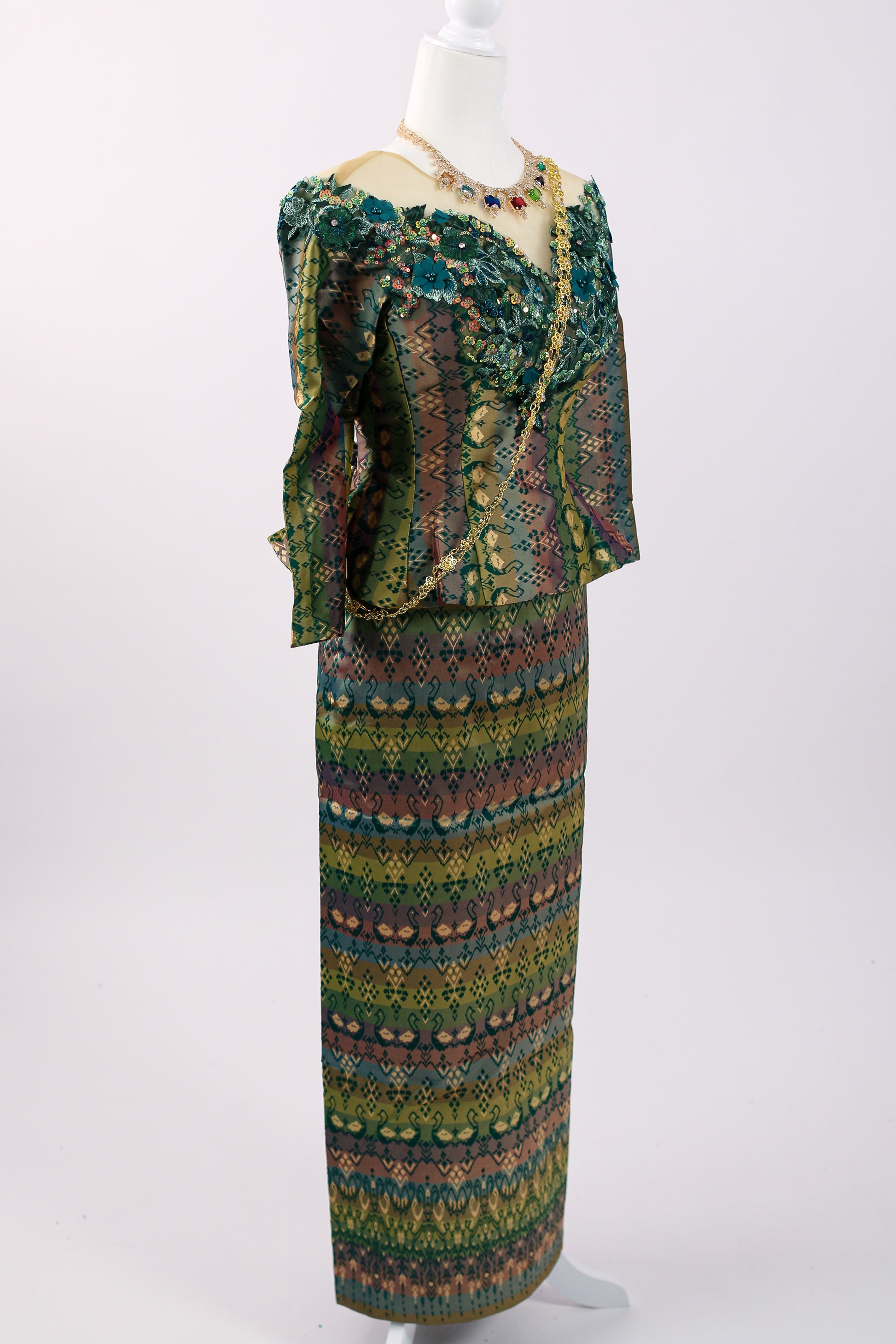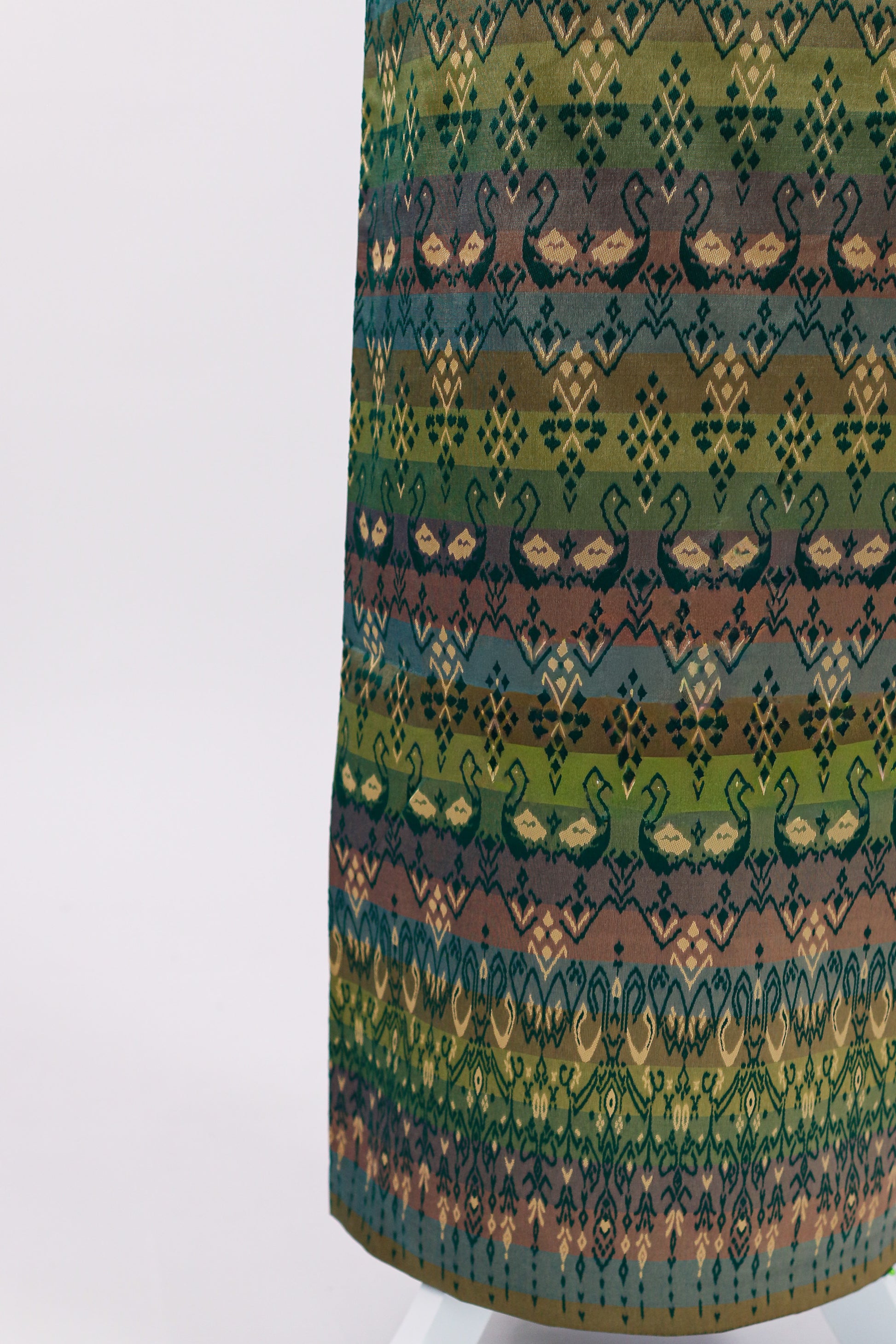 - Khmer multi-stripe geometric skirt in green/gold for texture