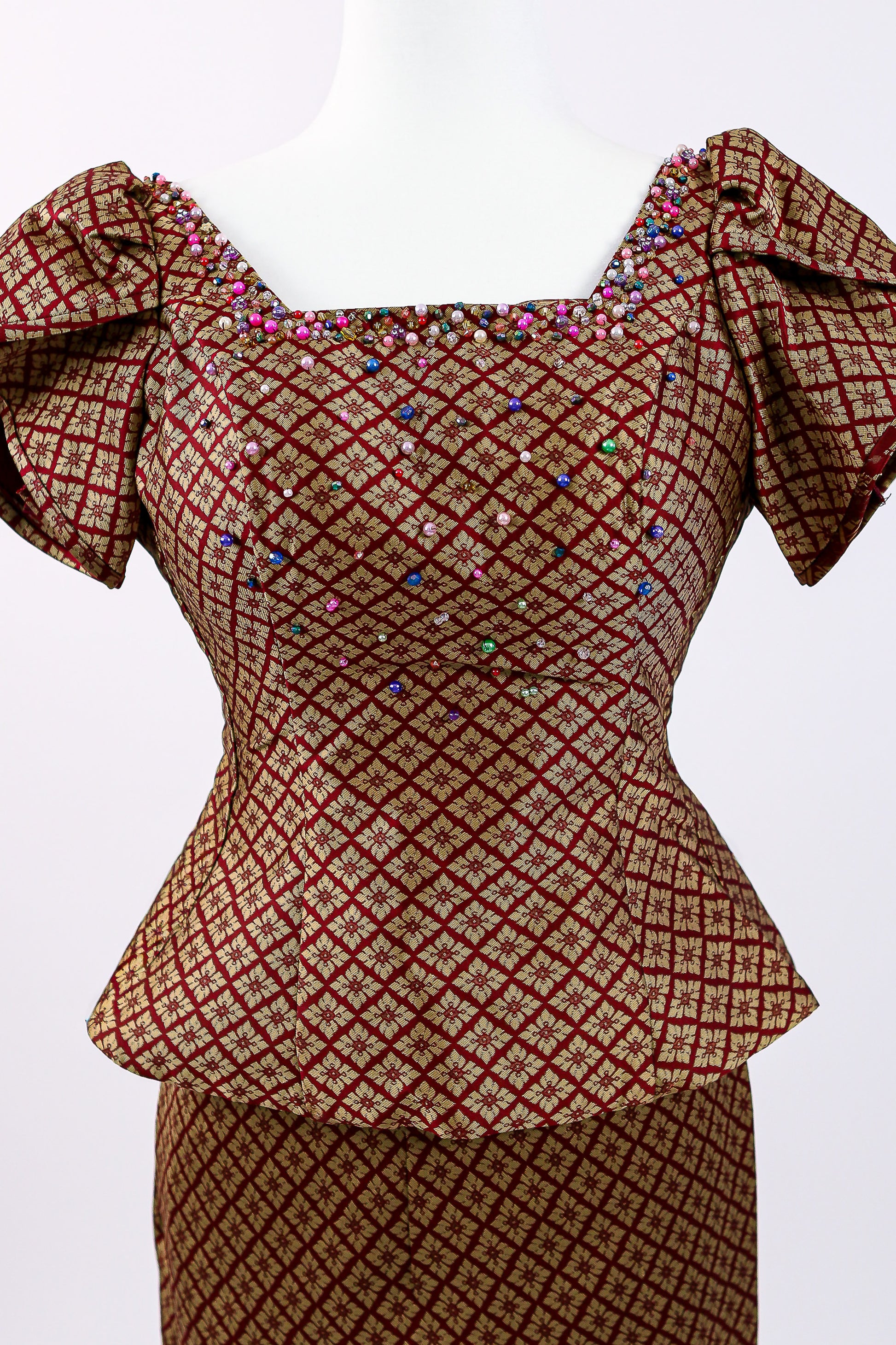 - Maroon brocade top with rounded sweetheart neckline and short structured sleeves
