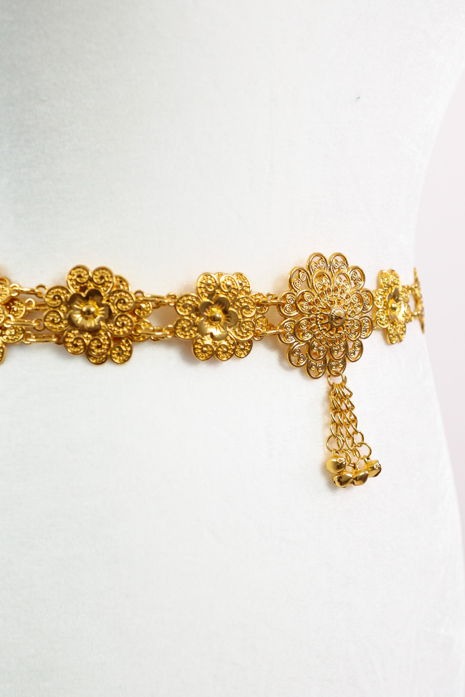 Fine floral links with a petite center and tassel for a subtle, graceful finish. Belt only included.