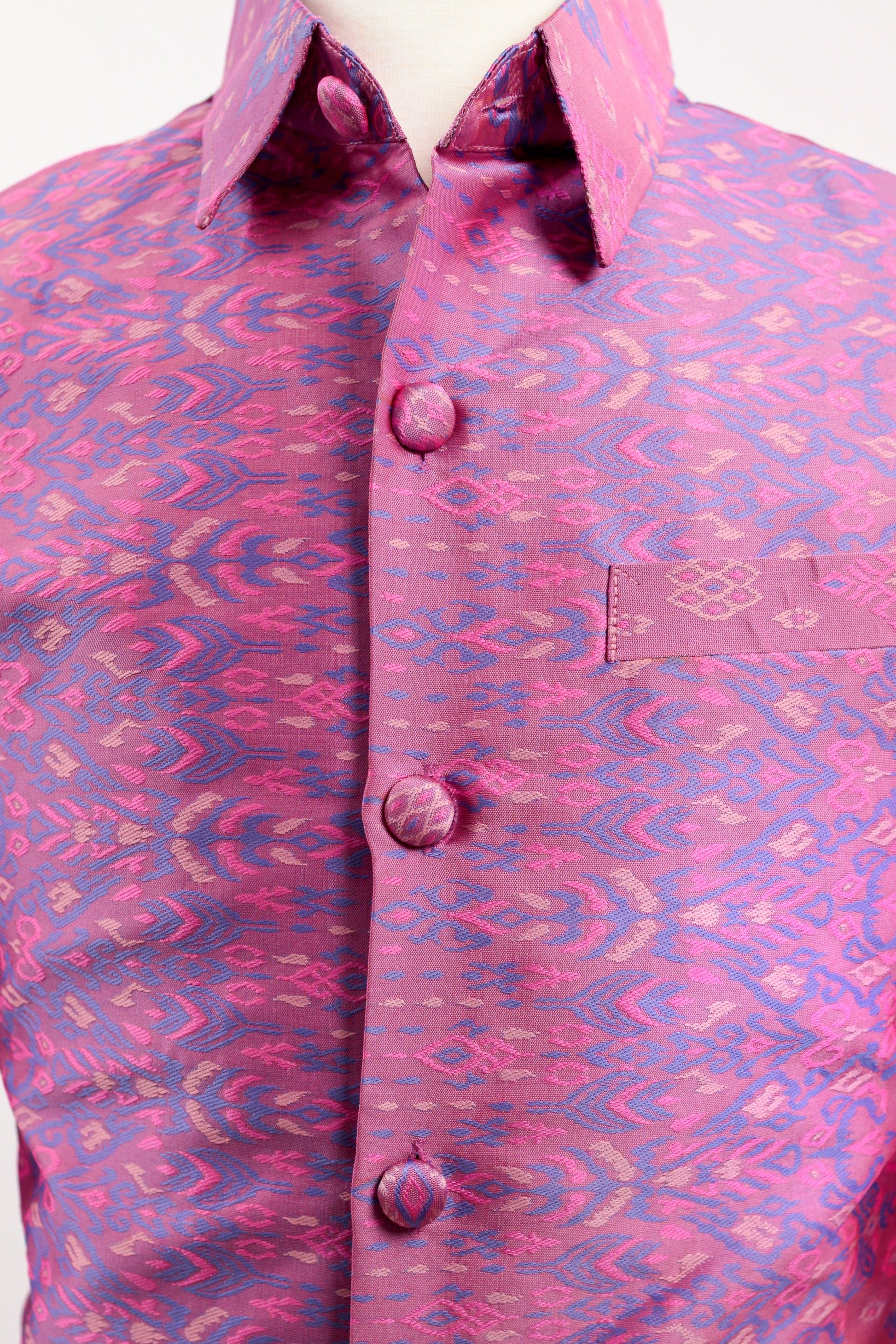 - Fabric: silk-effect woven (poly) with Khmer ikat pattern; smooth hand with a soft sheen