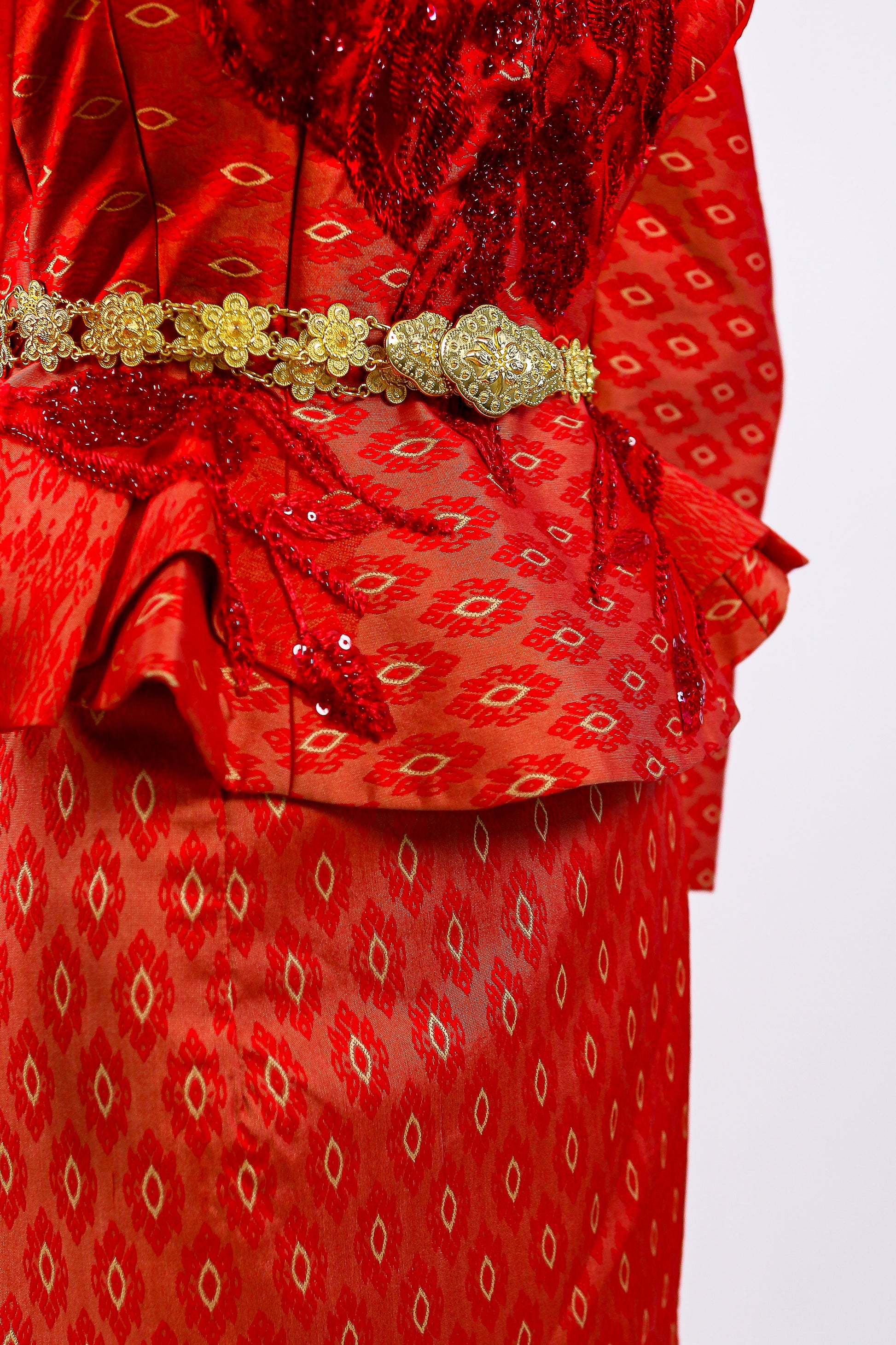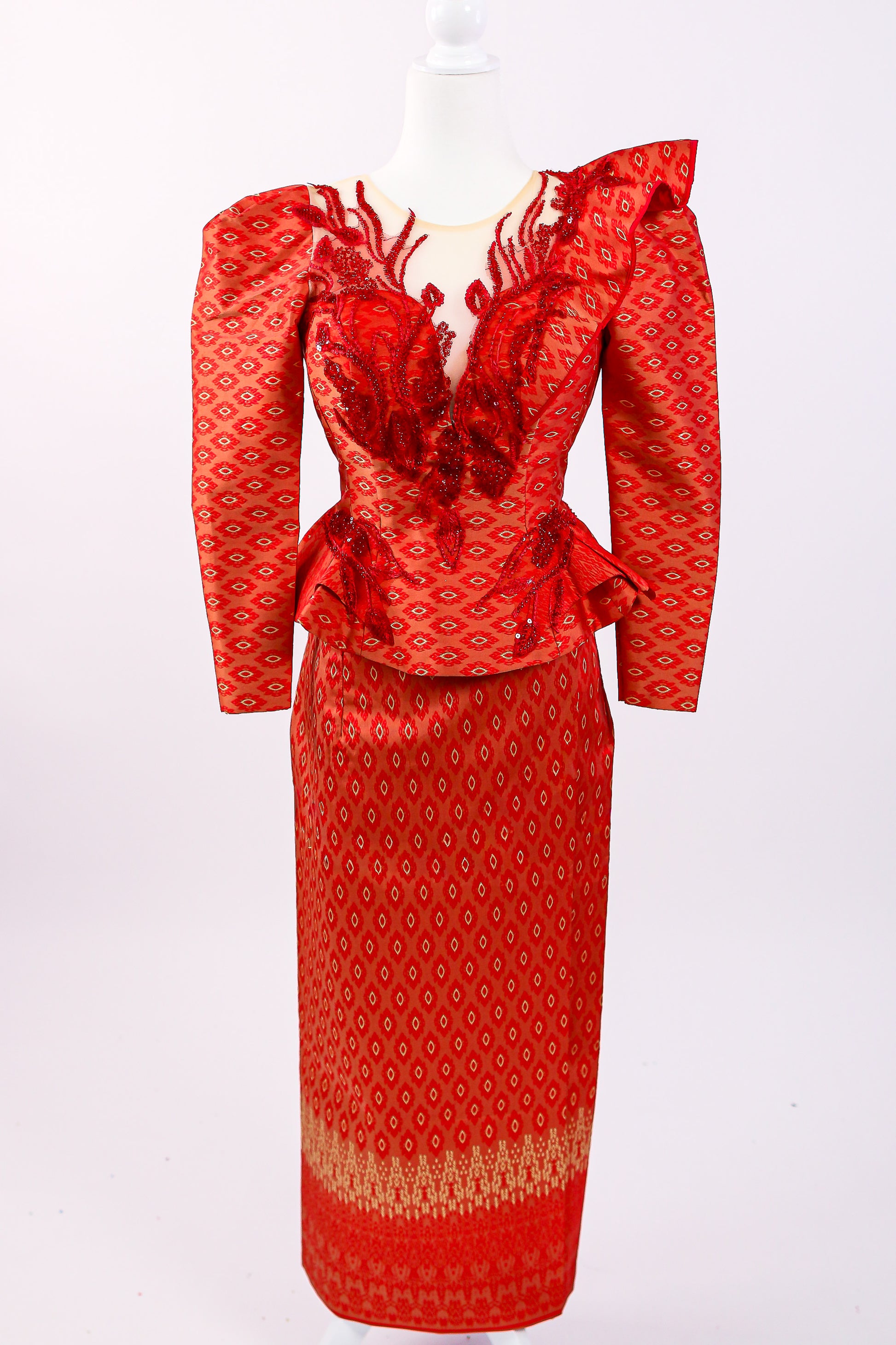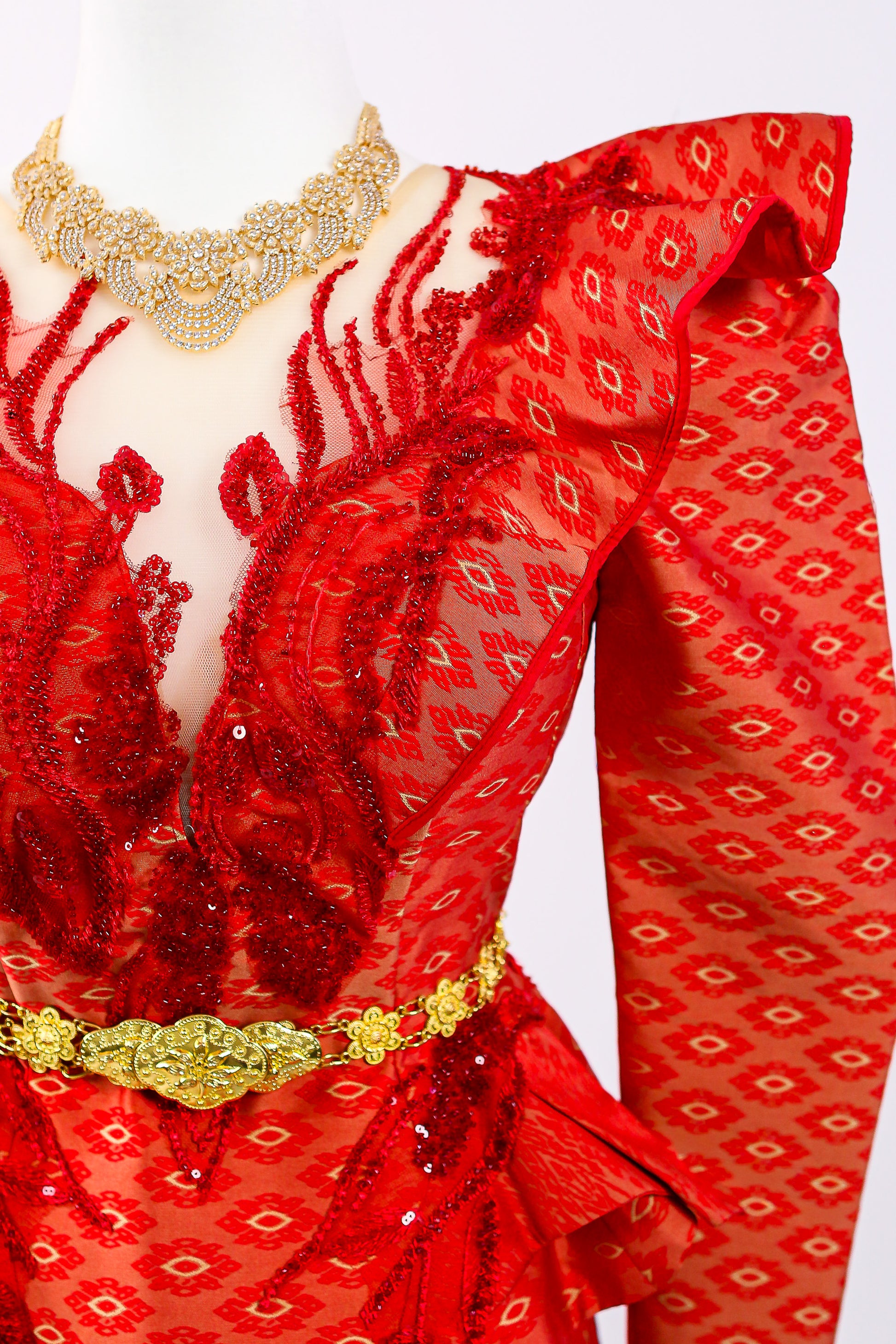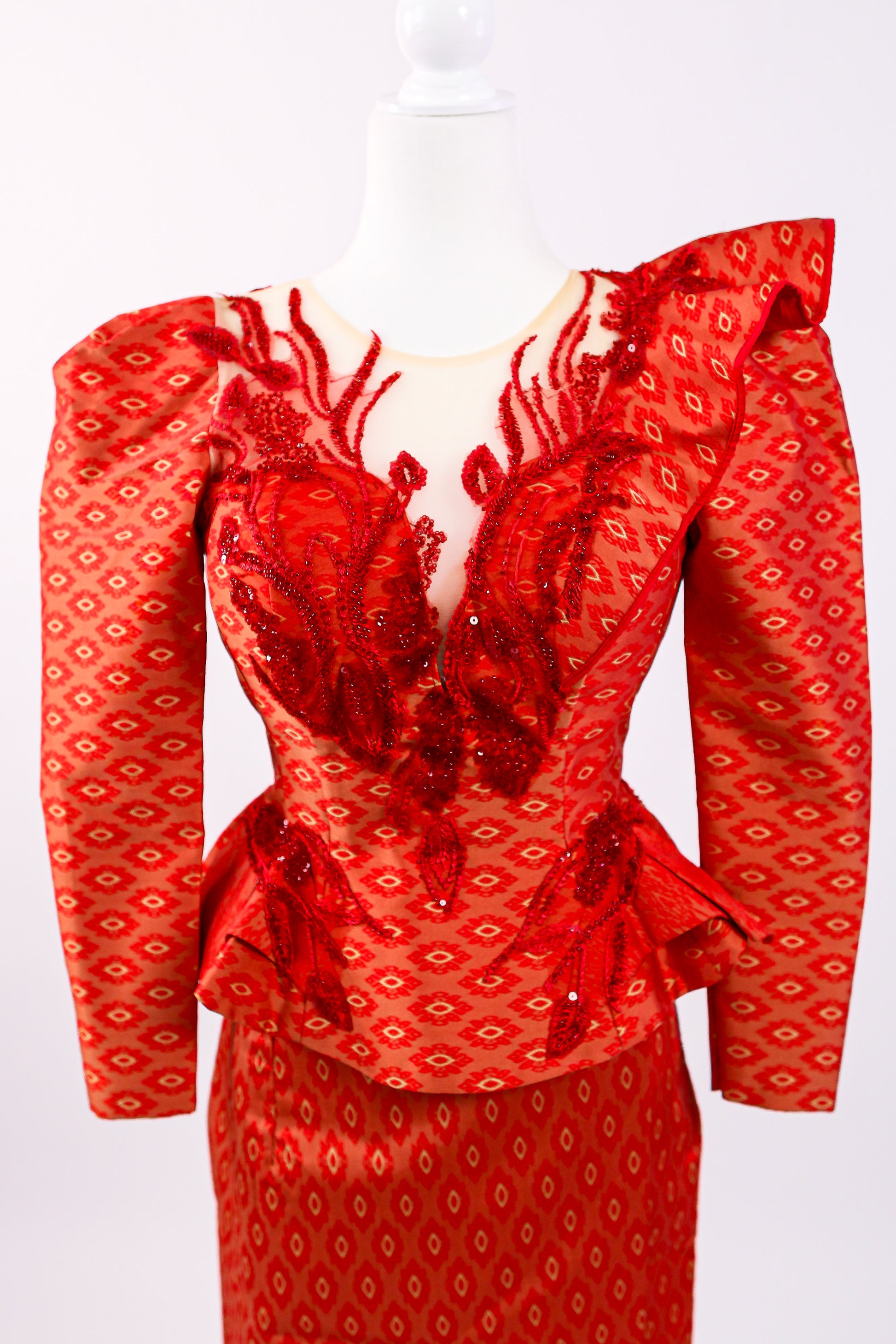 - Red appliqué Silk bodice with plunge-sweetheart look and long statement sleeves