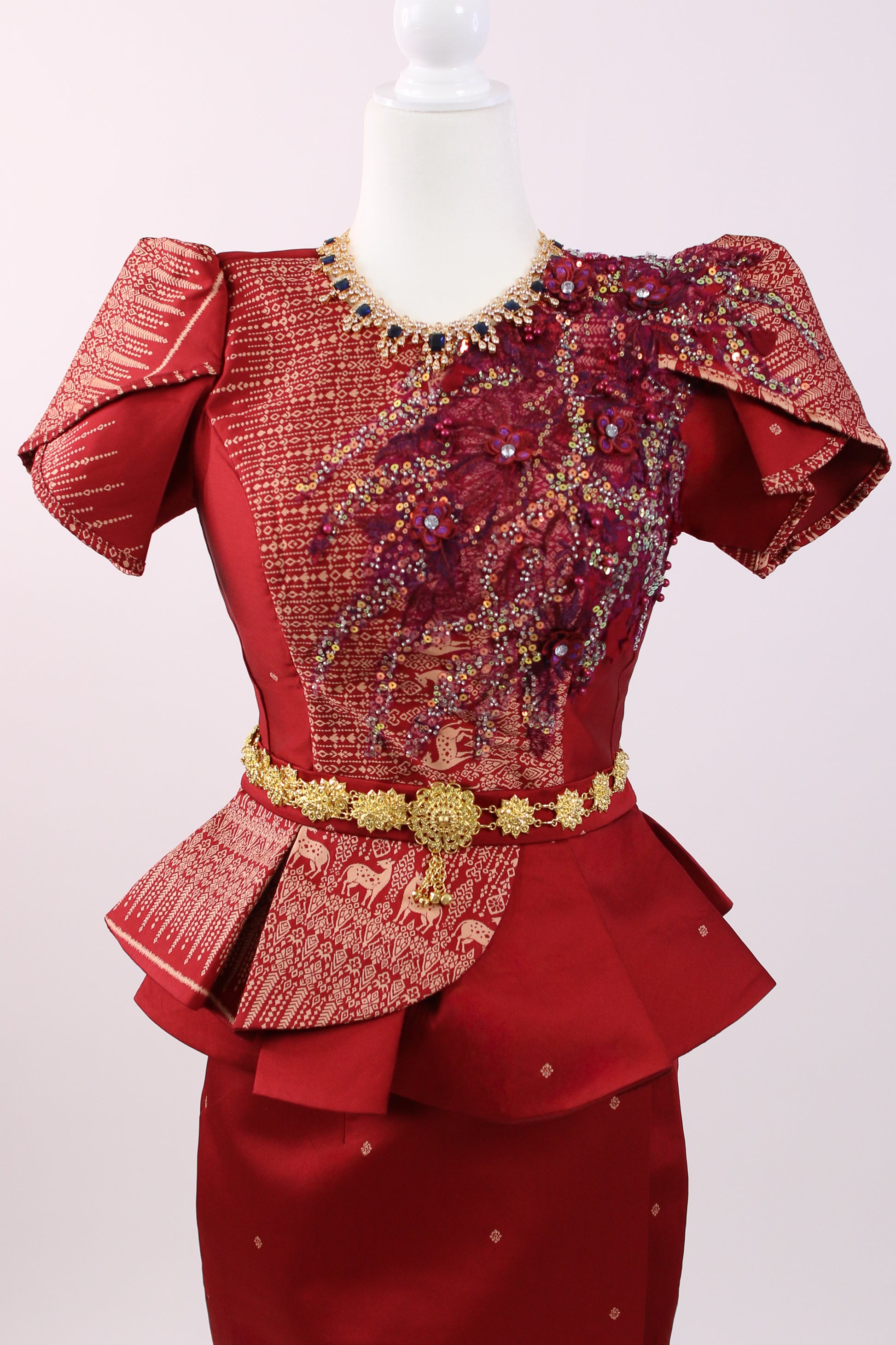 Crimson Dynasty Set — Beaded Lace Top + Geometric Skirt