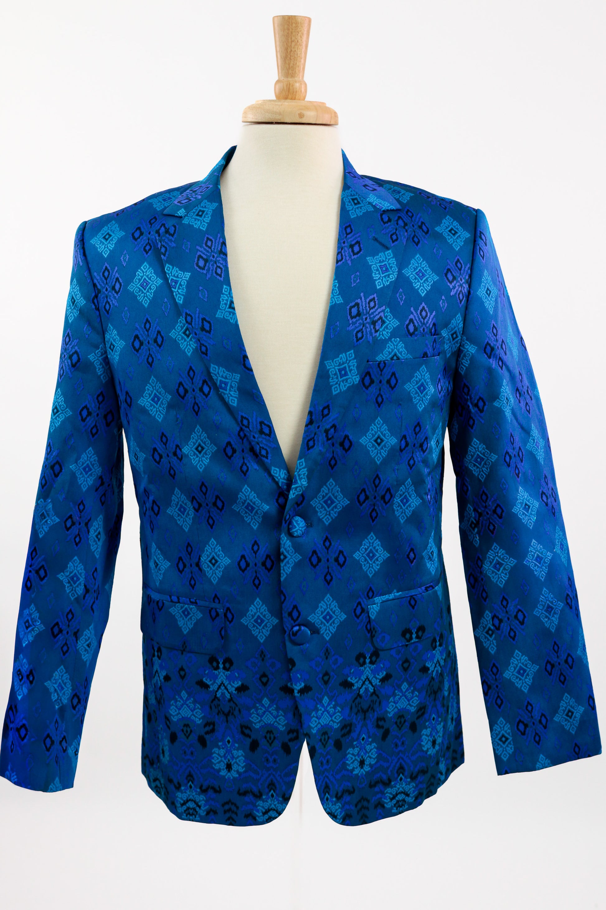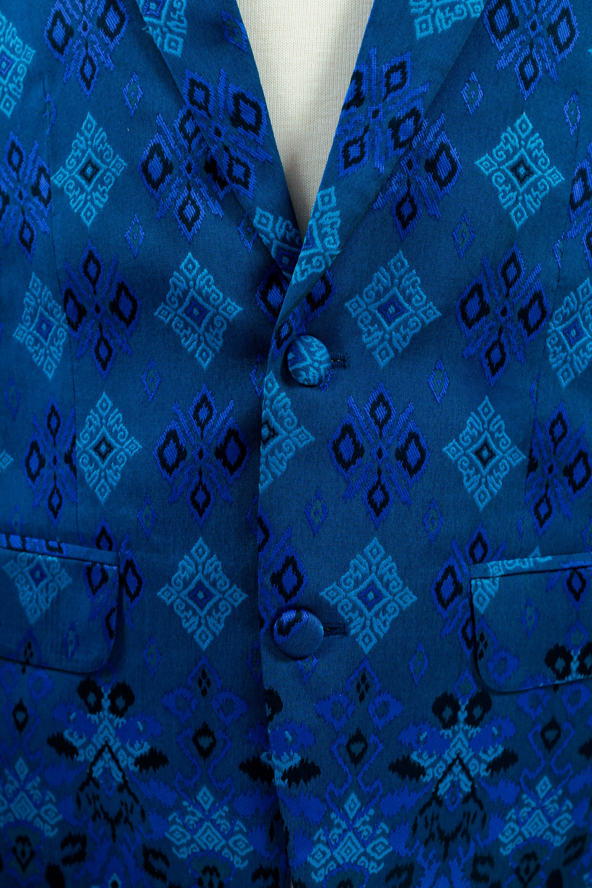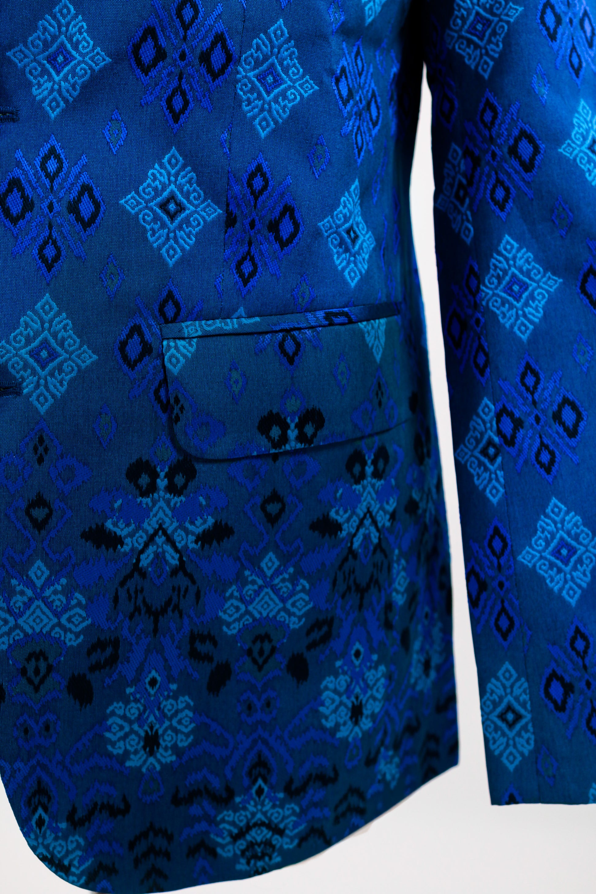 Statement sapphire pattern jacket, sharp lines with a royal touch.