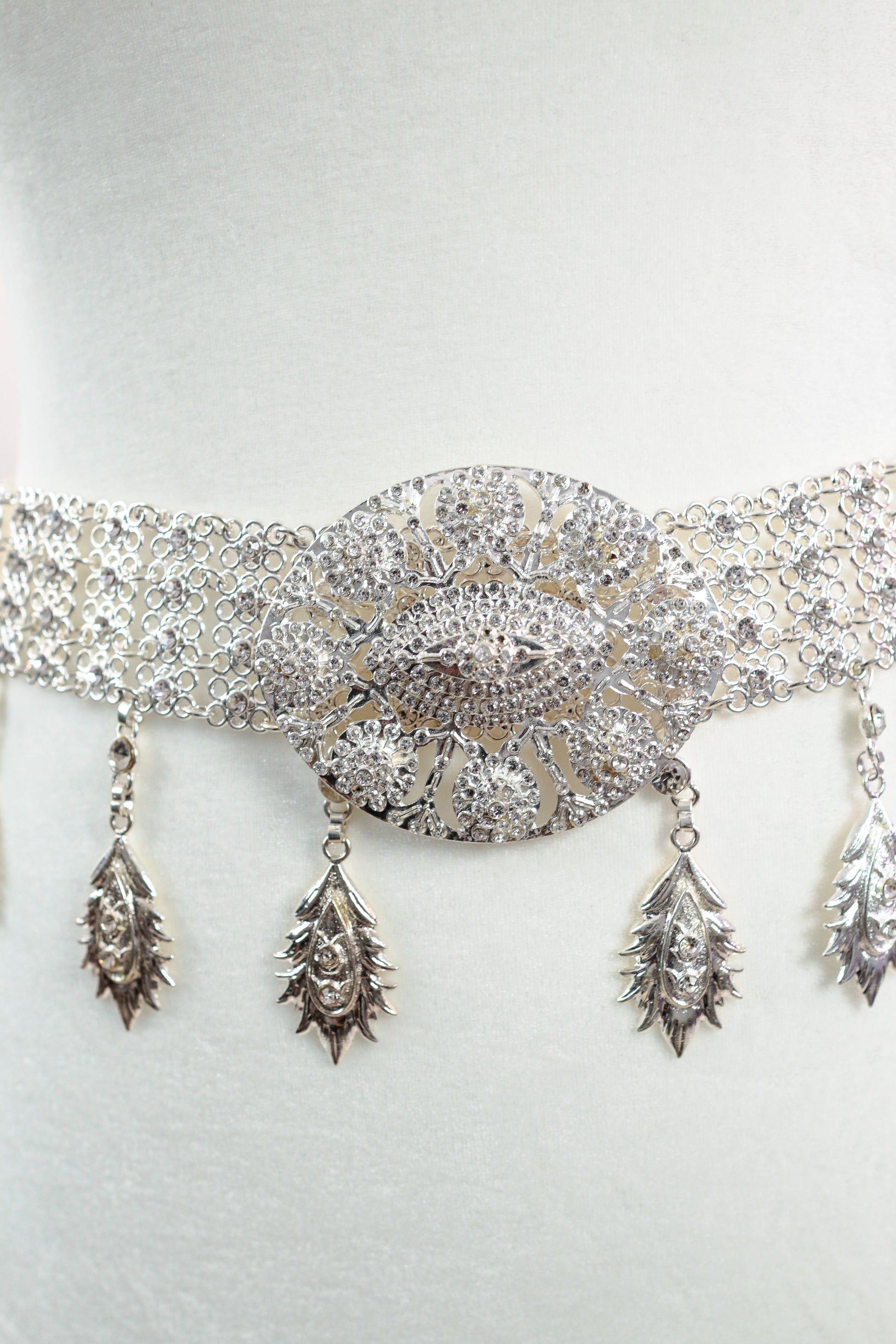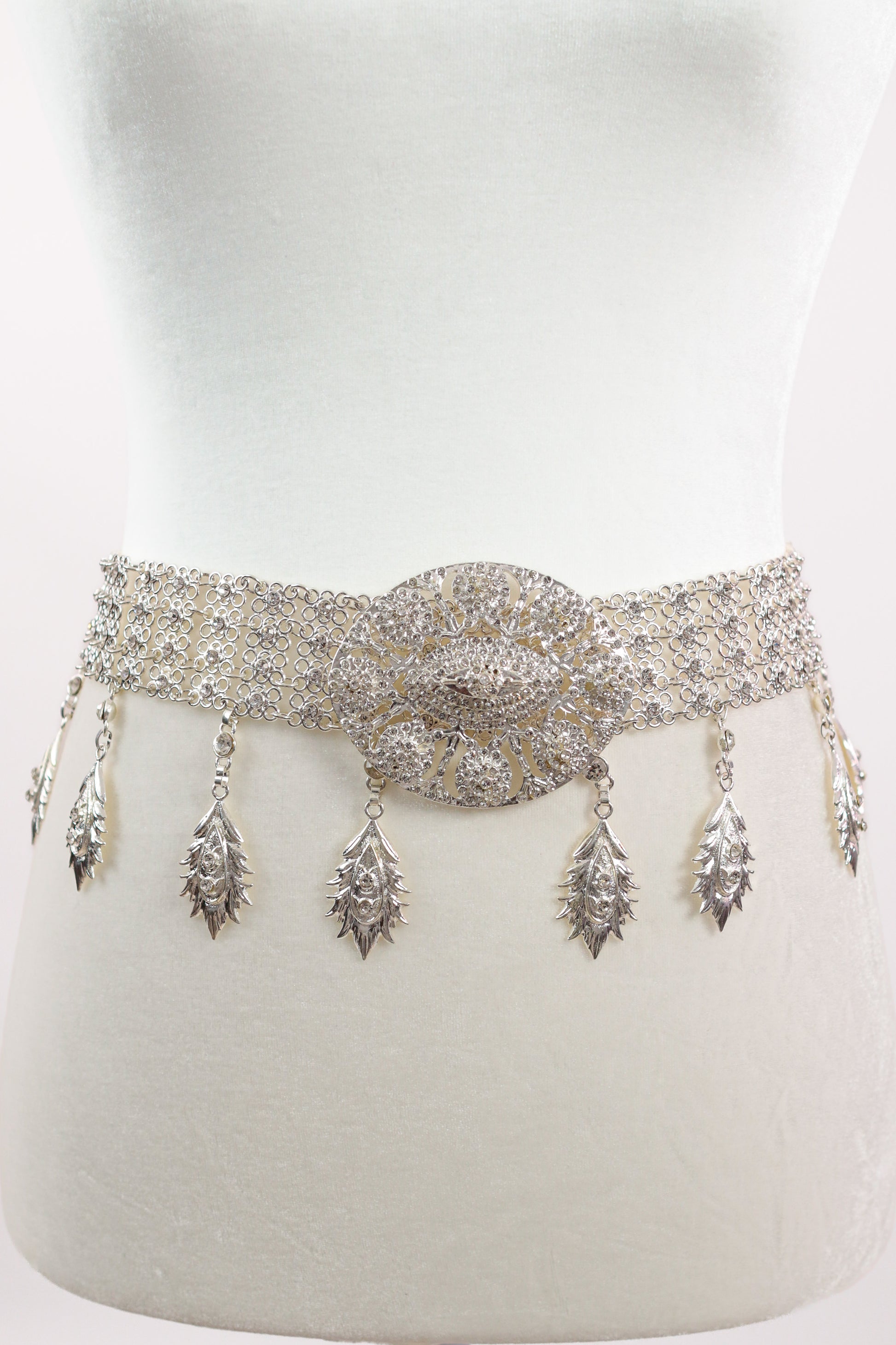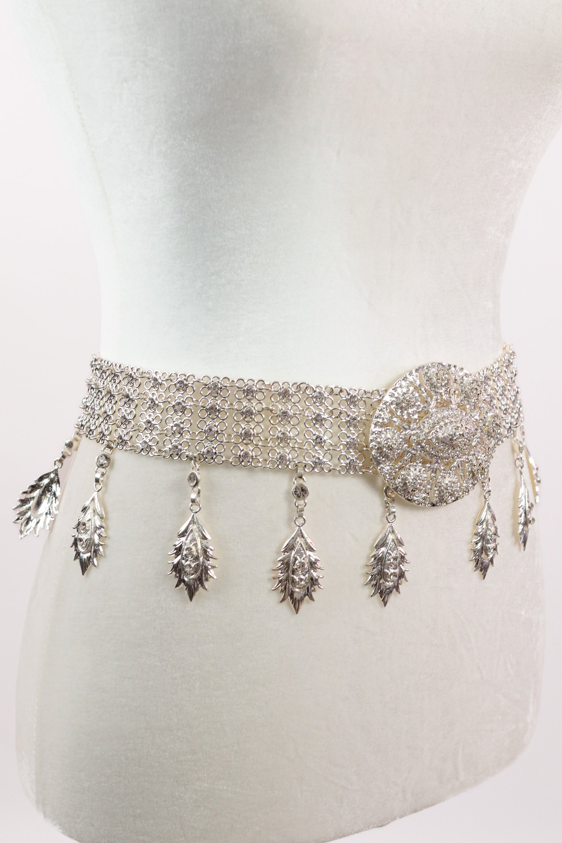 Dramatic multi-row sparkle with teardrop pendants for fluid movement. Belt only included.