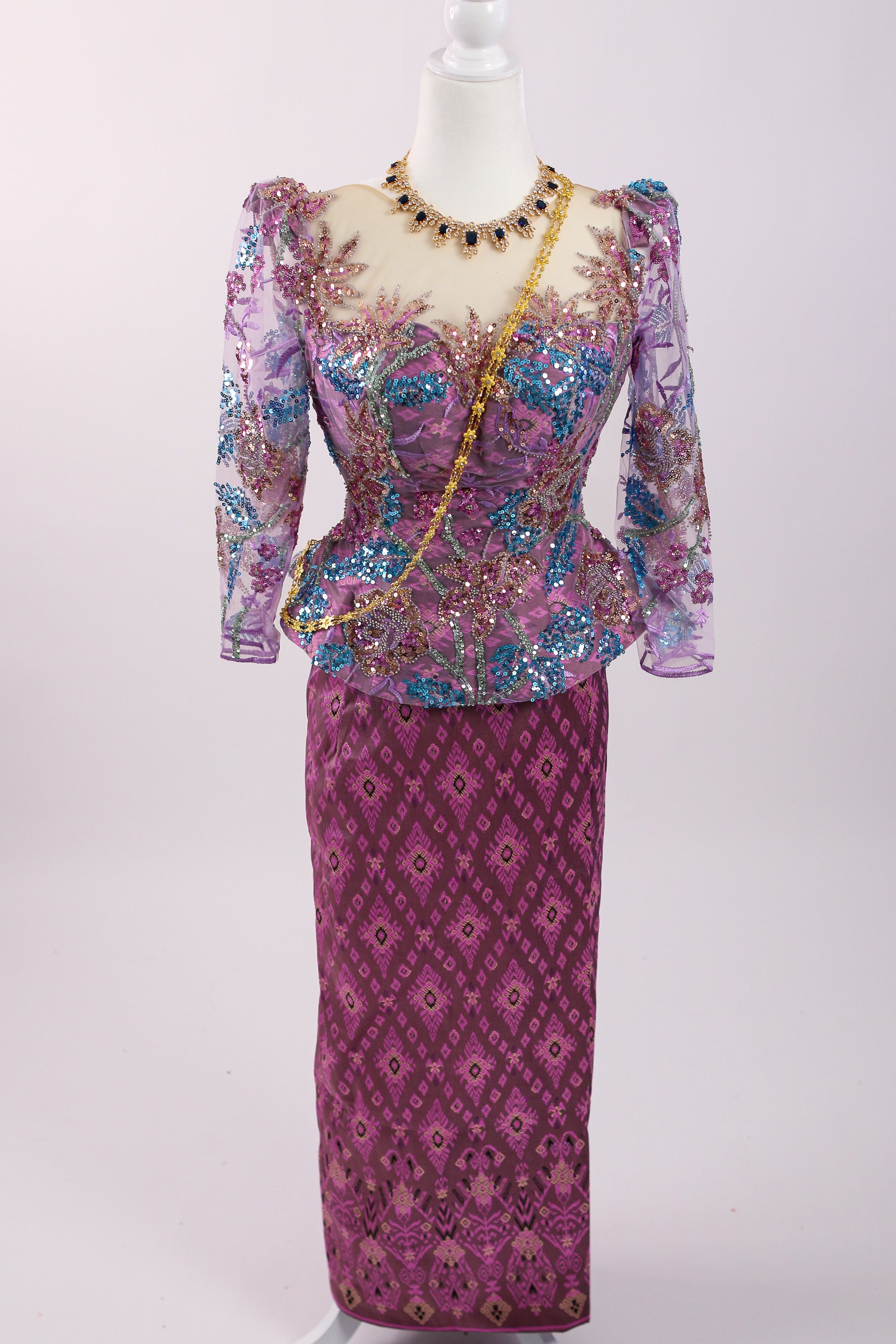 - Purple lace top with teal/lilac/gold beading, sweetheart/illusion neckline, and long sleeves
